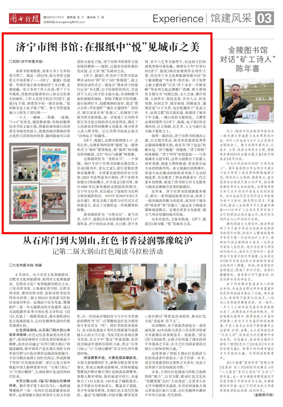 2025年7月4日,《图书馆报》03版《馆建风采》刊发《济宁市图书馆:在报纸中“悦”见城市之美》稿件,聚焦济宁市图书馆全方位开发公共文化服务多元模式,点赞“报纸“变身文旅宣传特色载体的创新实践经验。