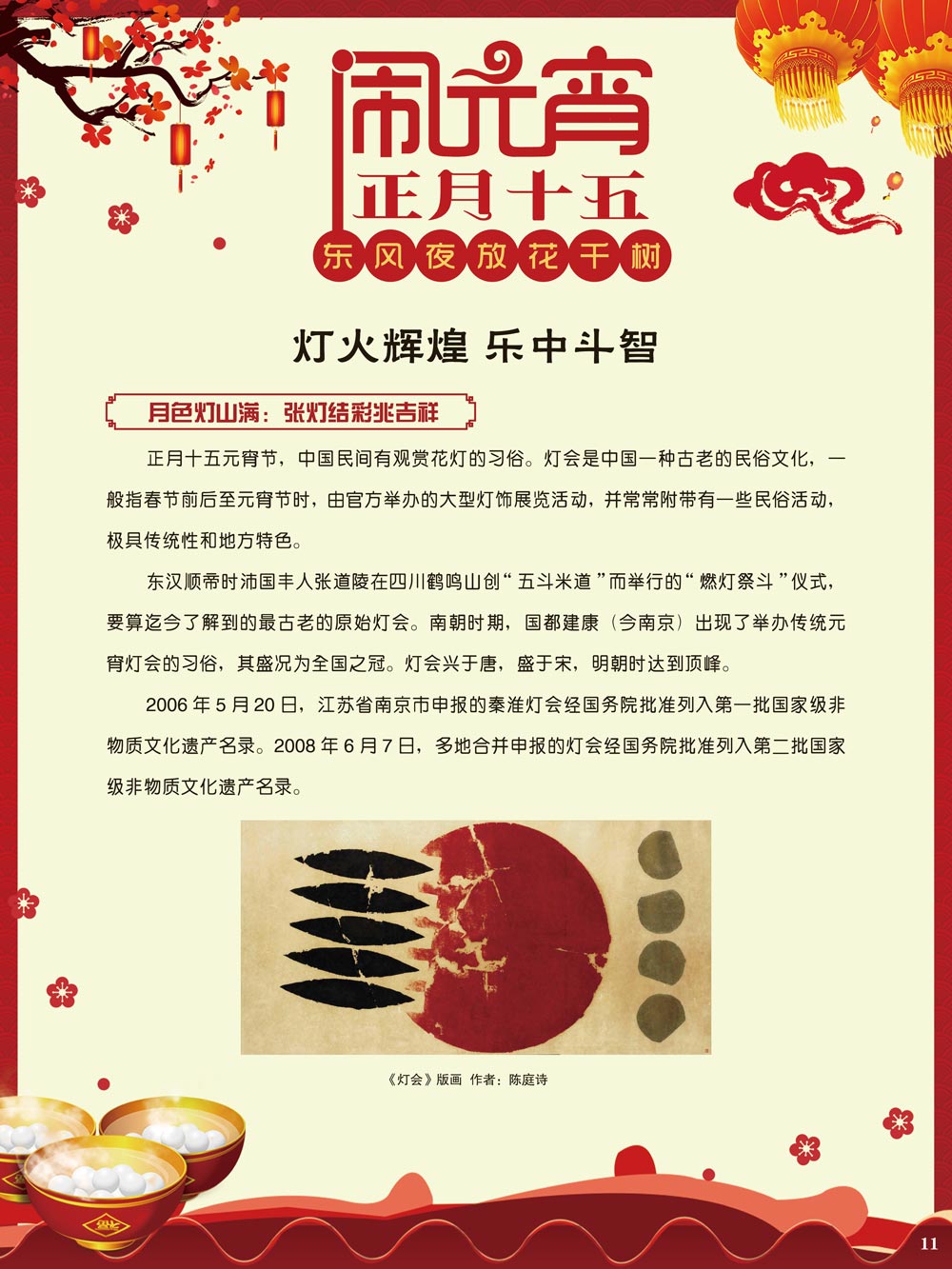 《东风夜放花千树——正月十五闹元宵》主题展览分为五个单元:“源远流长 瑰丽传说”“追星揽月 向往圆美”“灯火辉煌 乐中斗智”“龙腾狮跃 共庆新春”“诗意融融 岁月如歌”。策展团队特别策划了首批国家级非物质文化遗产——秦淮灯会、趣味猜灯谜画谜、非遗项目——晓云绣花龙、软萌创意汤圆展示四大板块,致力于为观众呈现一个充满年味、欢天喜地的元宵佳节,欢迎社会各界朋友前来观展!