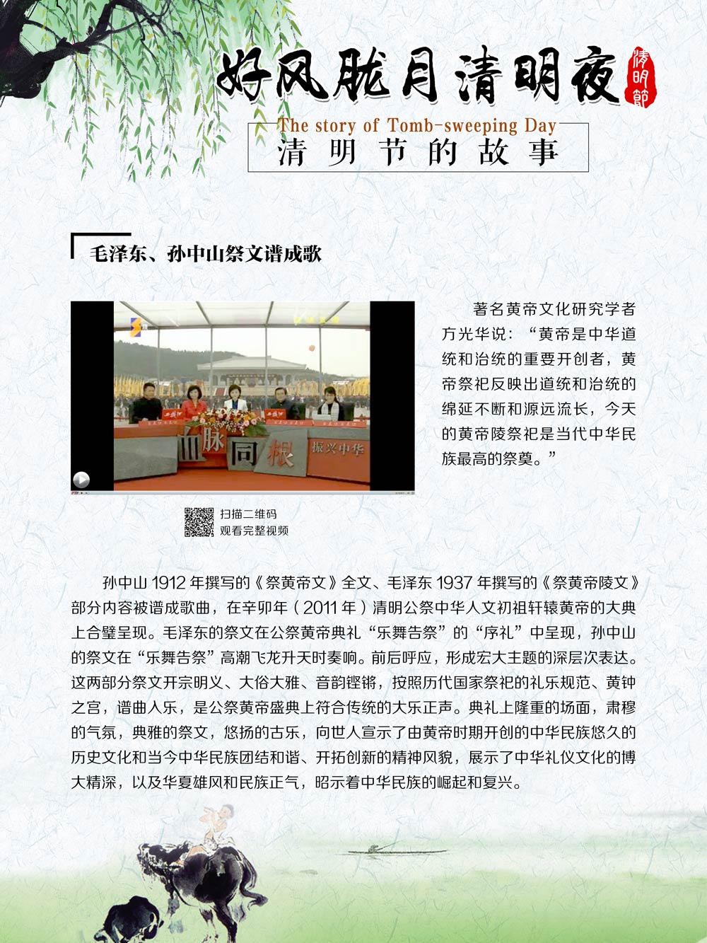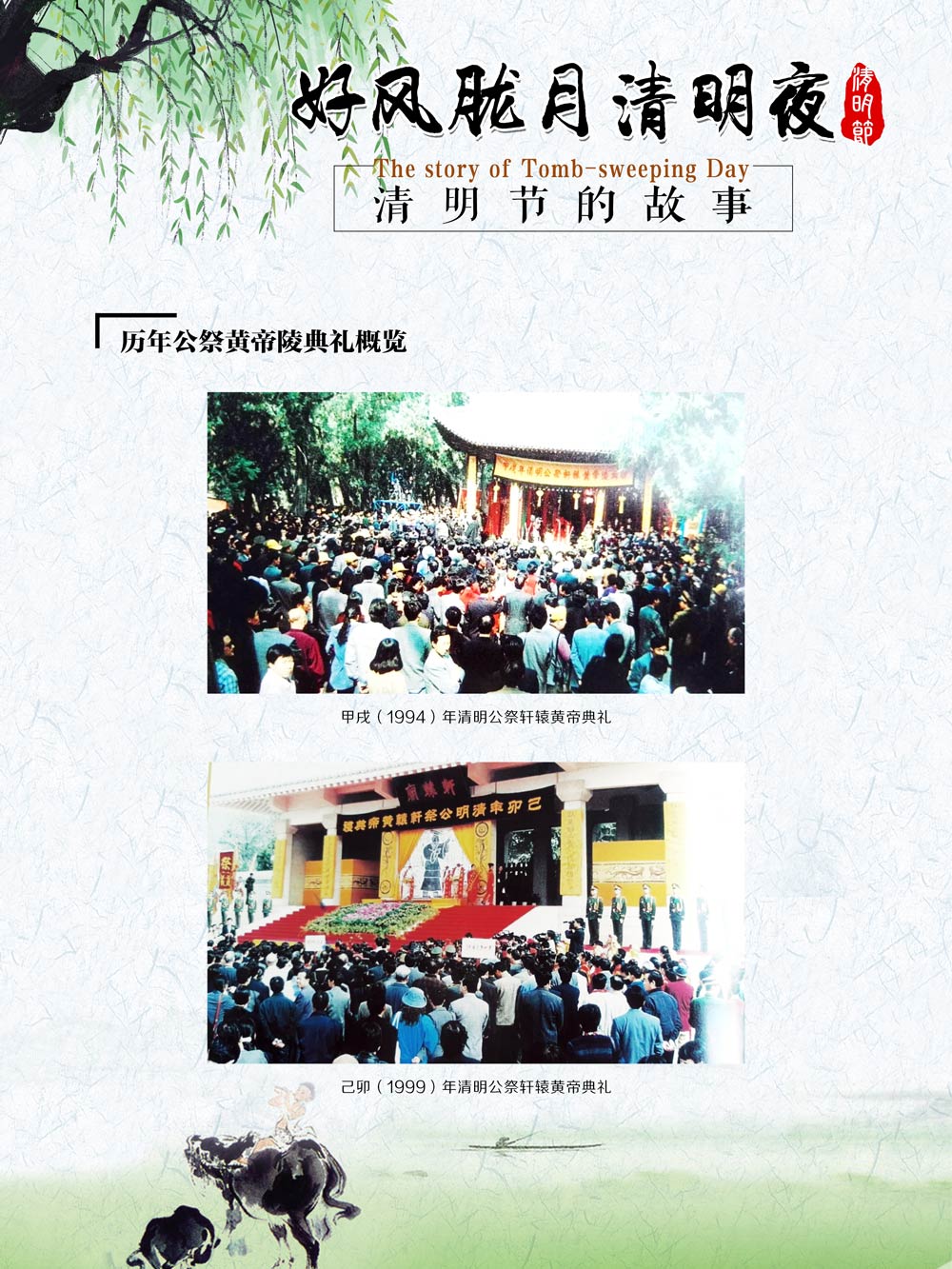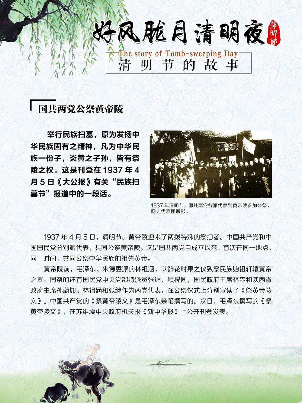 《好风胧月清明夜——清明节的故事》主题展览共分为五个单元:“节日溯源 有容乃大”“同归桑梓 慎终追远”“插柳踏春 环保健身”“清明知味 风俗食物”“吟咏绵延 清明永驻”,其中特别策划了“国共两党公祭黄帝陵”、“毛泽东祭黄帝陵文”、“孙中山题词黄帝陵”、国家非物质文化遗产项目“大槐树祭祖习俗”、互动体验“网上祭英烈”和“踏青赏景找不同”六大看点,让您全方位多层次地体验清明节的文化内涵与风姿魅力。 春生孳乳,万物繁炽,天明地洁,气象清朗。时值农历阳春三月,清明节到来之际,我们特别举办此展览,以期在现代文明的催护下,共守传统文化根脉,共勉文明传承重任,为推动社会主义文化繁荣兴盛,贡献我们的智慧和力量。愿清明常在,民族不老。