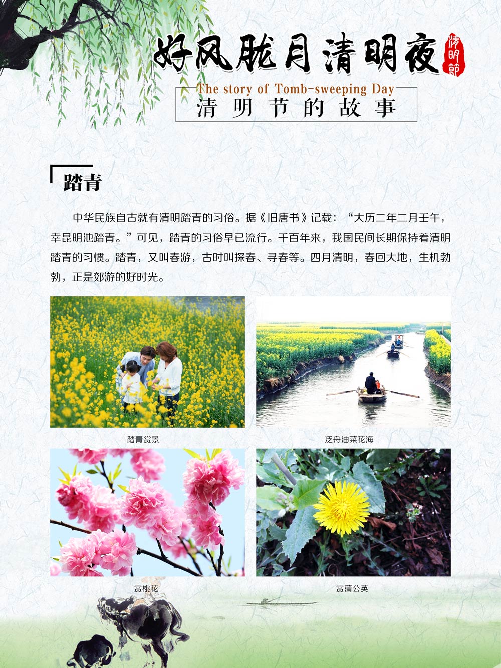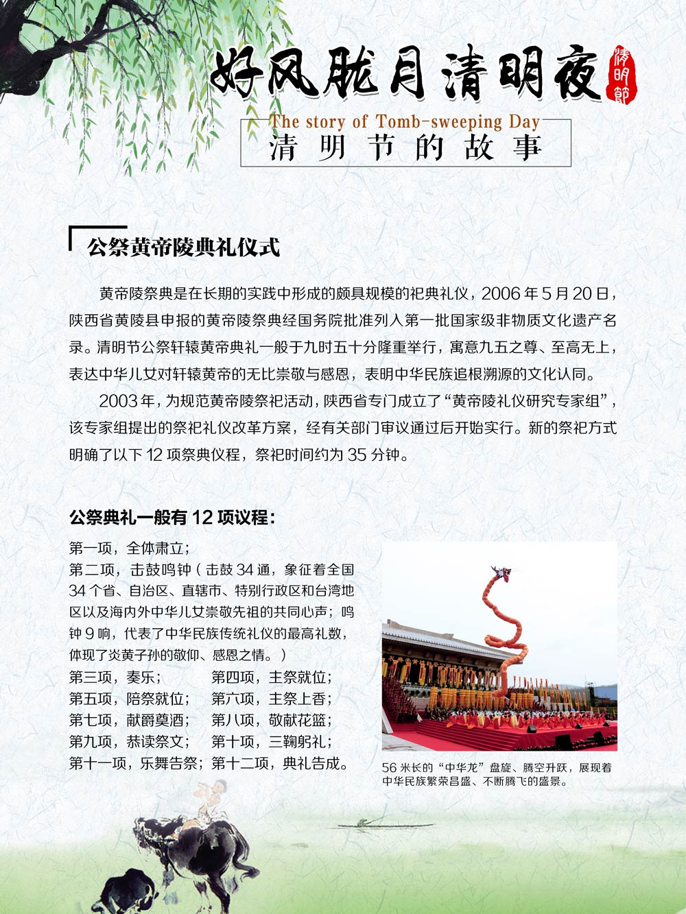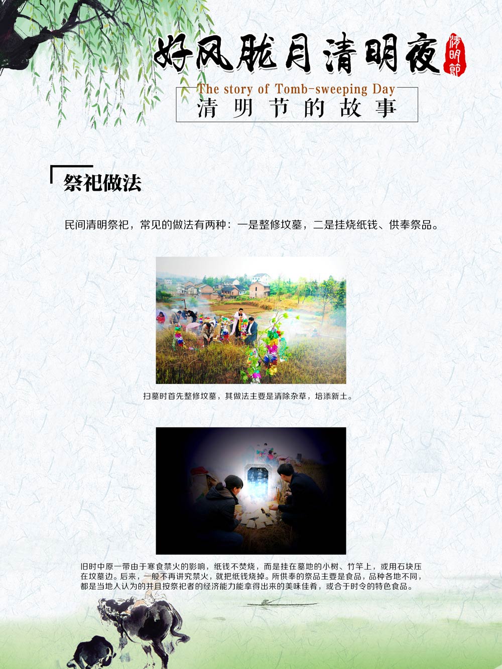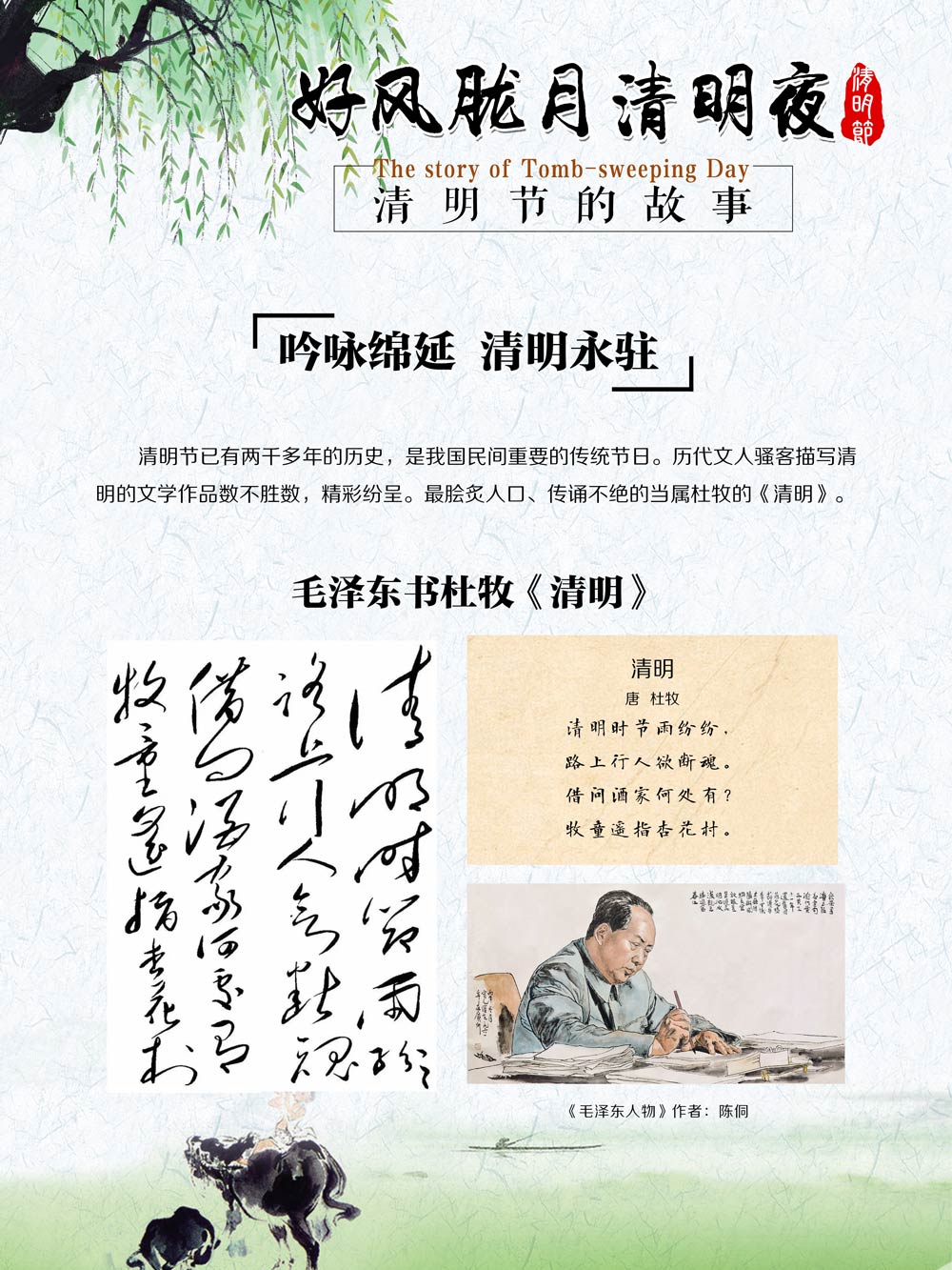 《好风胧月清明夜——清明节的故事》主题展览共分为五个单元:“节日溯源 有容乃大”“同归桑梓 慎终追远”“插柳踏春 环保健身”“清明知味 风俗食物”“吟咏绵延 清明永驻”,其中特别策划了“国共两党公祭黄帝陵”、“毛泽东祭黄帝陵文”、“孙中山题词黄帝陵”、国家非物质文化遗产项目“大槐树祭祖习俗”、互动体验“网上祭英烈”和“踏青赏景找不同”六大看点,让您全方位多层次地体验清明节的文化内涵与风姿魅力。 春生孳乳,万物繁炽,天明地洁,气象清朗。时值农历阳春三月,清明节到来之际,我们特别举办此展览,以期在现代文明的催护下,共守传统文化根脉,共勉文明传承重任,为推动社会主义文化繁荣兴盛,贡献我们的智慧和力量。愿清明常在,民族不老。
