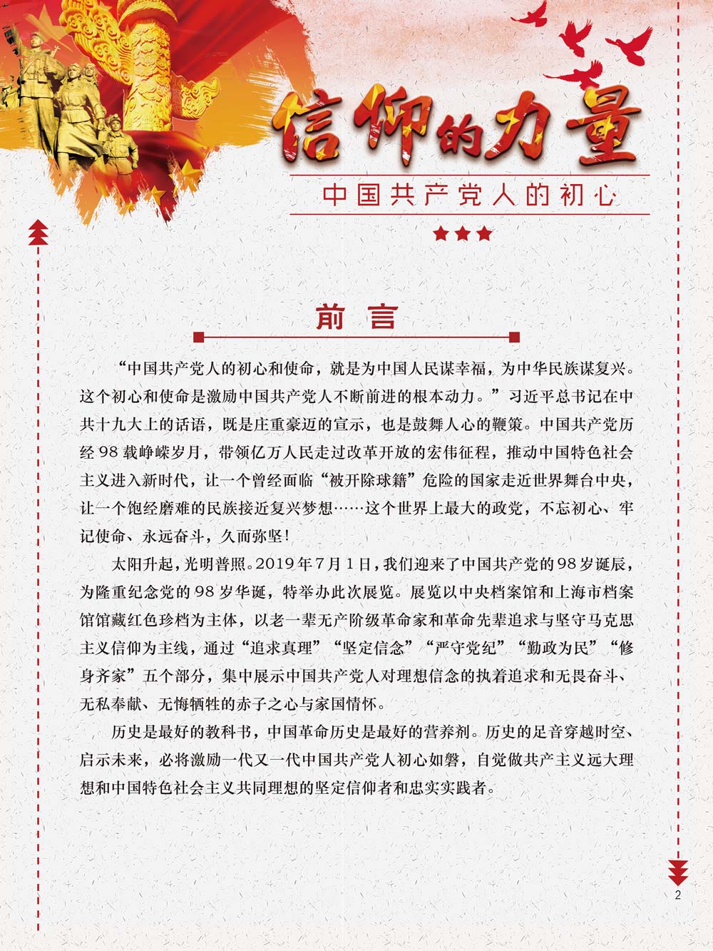 太阳升起,光明普照。2019 年7 月1 日,我们迎来了中国共产党的98 岁诞辰,为隆重纪念党的98 岁华诞,特举办此次展览。展览以中央档案馆和上海市档案馆馆藏红色珍档为主体,以老一辈无产阶级革命家和革命先辈追求与坚守马克思主义信仰为主线,通过“追求真理”“坚定信念”“严守党纪”“勤政为民”“修身齐家”五个部分,集中展示中国共产党人对理想信念的执着追求和无畏奋斗、无私奉献、无悔牺牲的赤子之心与家国情怀。 历史是最好的教科书,中国革命历史是最好的营养剂。历史的足音穿越时空、 启示未来,必将激励一代又一代中国共产党人初心如磐,自觉做共产主义远大理想和中国特色社会主义共同理想的坚定信仰者和忠实实践者。 信端全景展:http://ls.kanzhanlan.cn/wx/010106/41/index.html