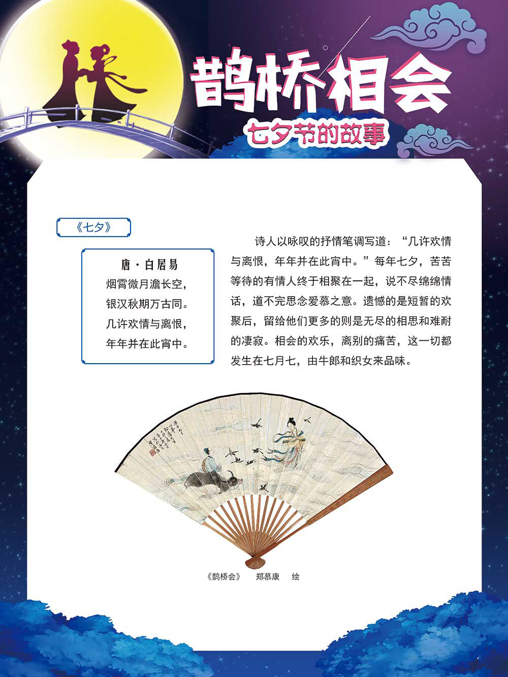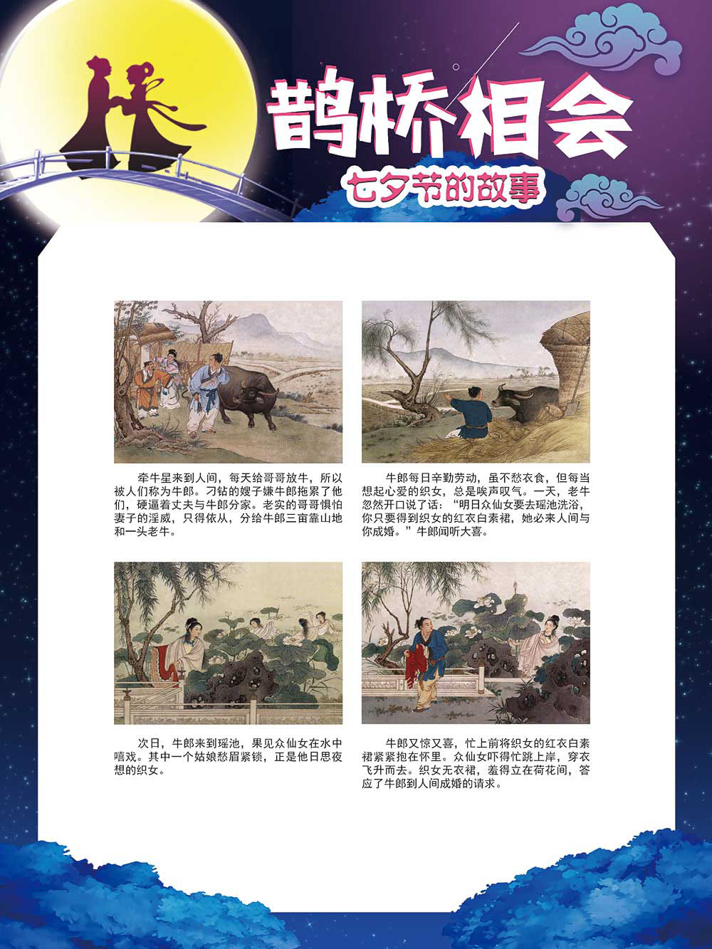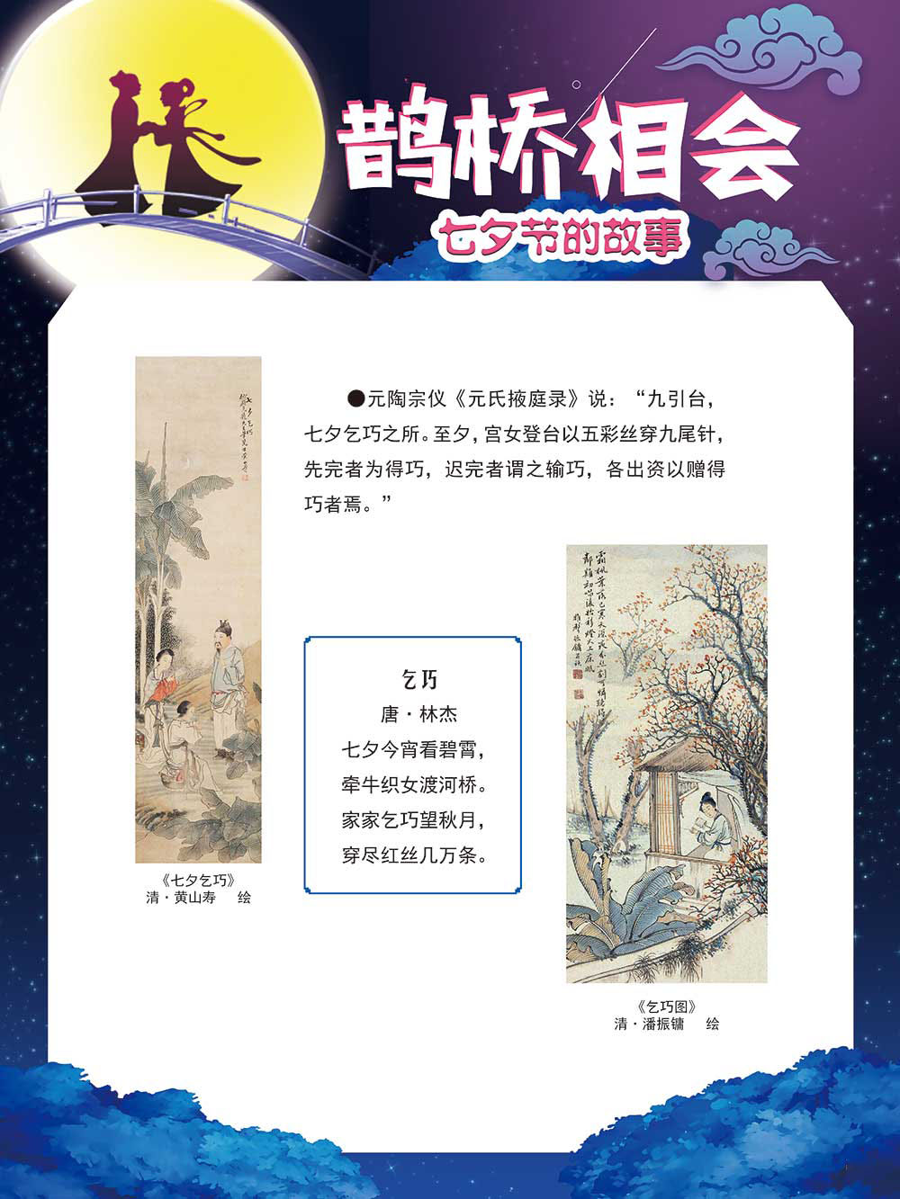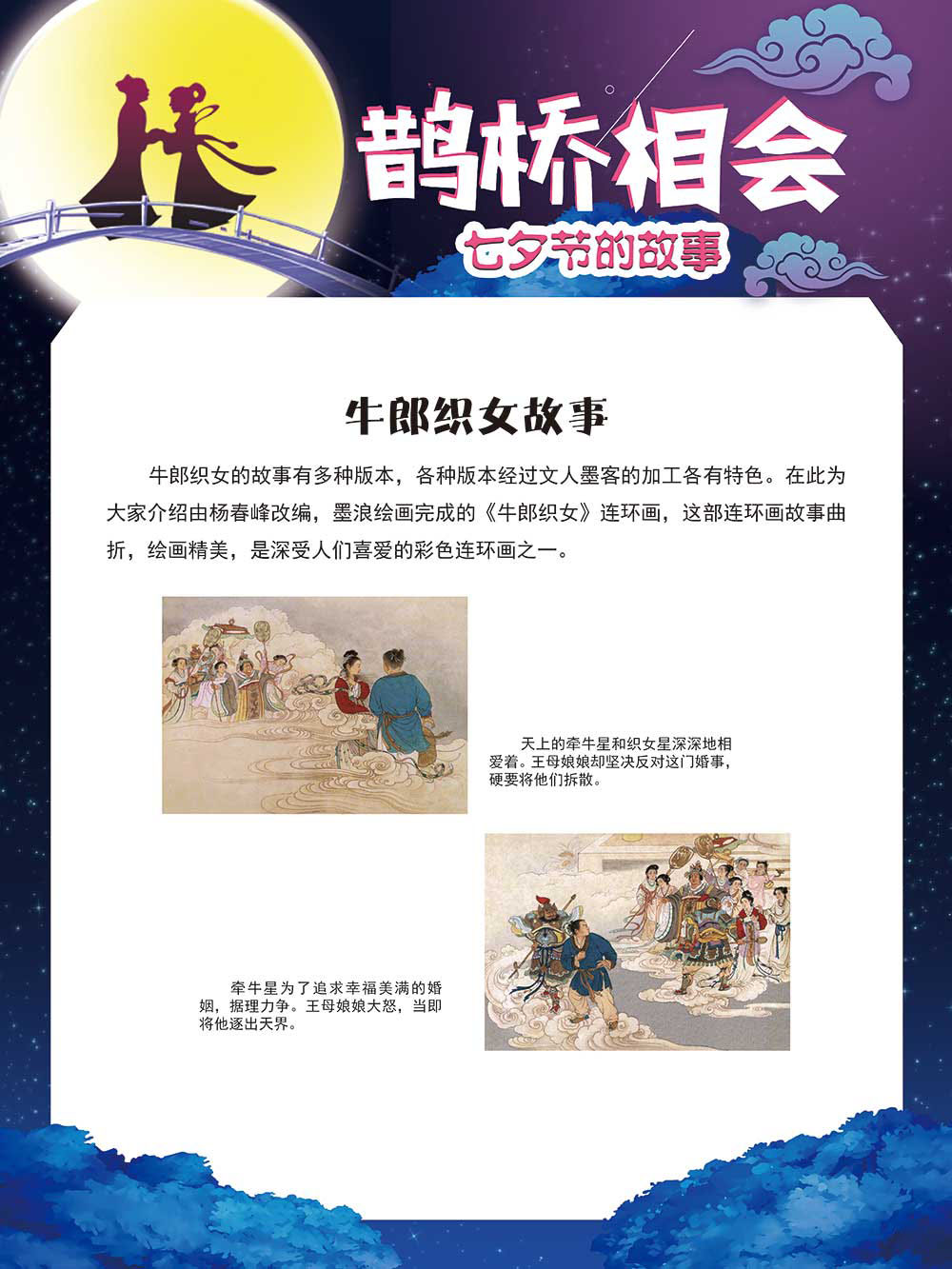 七夕节是中华民族重要的传统节日,在我国民间传统节日中是一个非常具有浪漫色彩的节日。自牛郎织女传说融入七夕节后,牛郎织女鹊桥相会的爱情故事流传千古,深入人心,这也就成为七夕节的主要内容。 2006年七夕节被国务院列入第一批国家级非物质文化遗产名录。“七夕节”是世界上最早的爱情节日,其体现的自由浪漫的爱情观、勤奋朴实的劳动观以及诠释的爱情永恒主题,彰显了传统文化的魅力。七夕文化中的乞巧、祈福活动体现了中华民族勤劳智慧、自强不息、勇于创造,不断追求更加幸福美好生活的精神。 本展览通过国画、连环画、摄影图像和七夕相关的诗歌等内容为您综合介绍七夕节文化内涵,以及民间的各种习俗和当下七夕节的传承和发展。