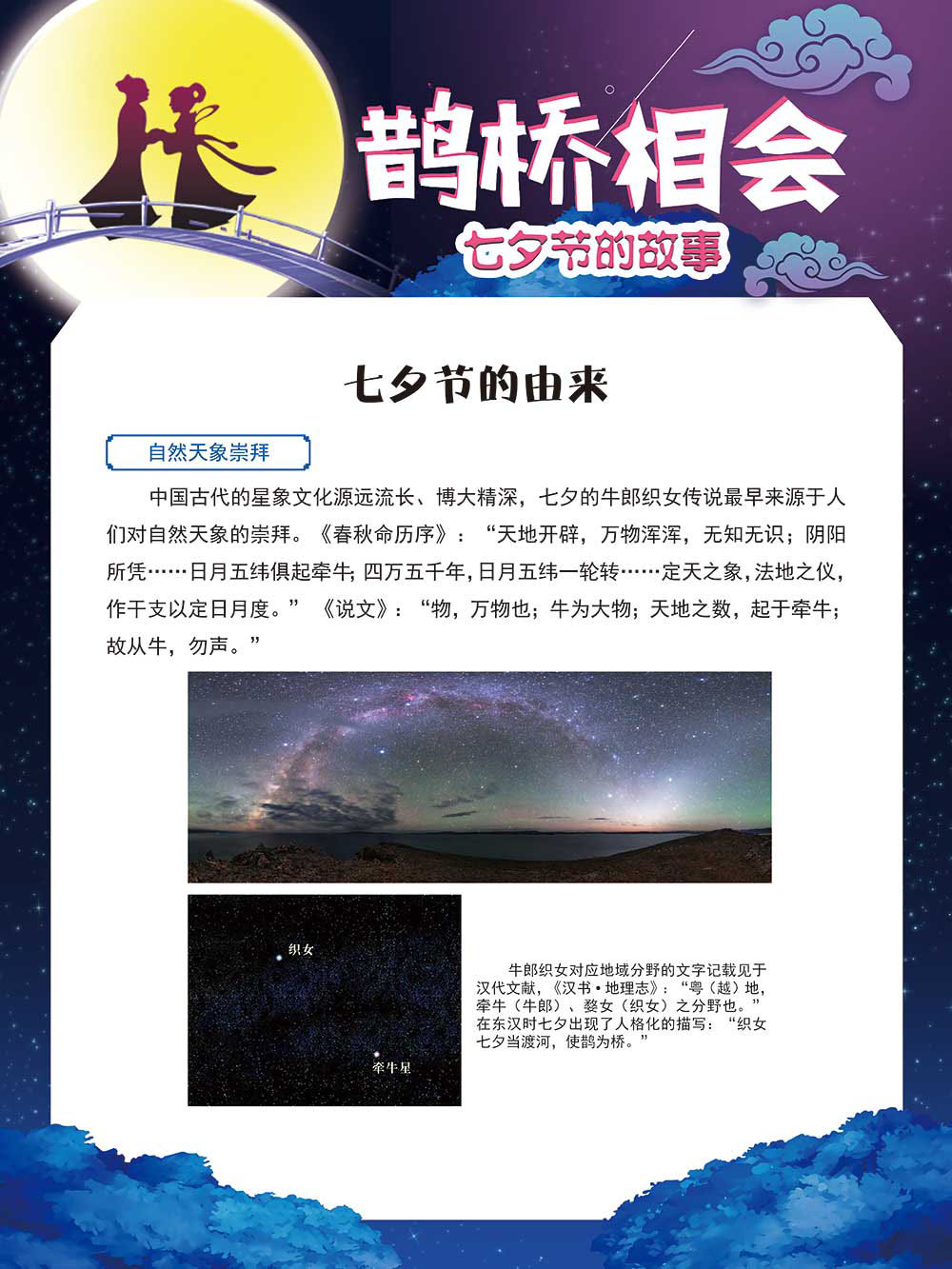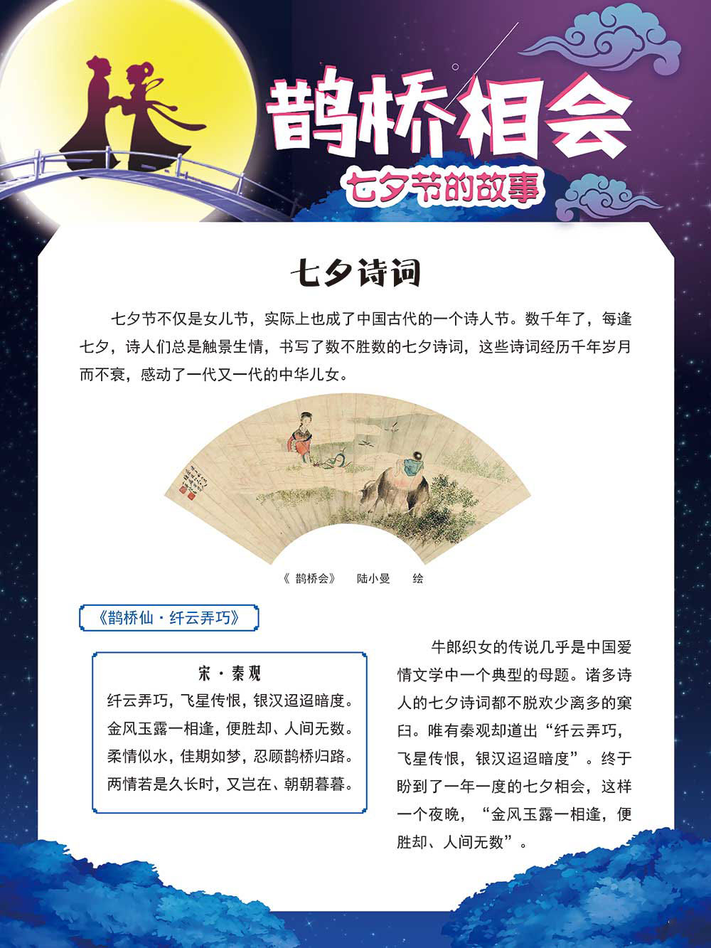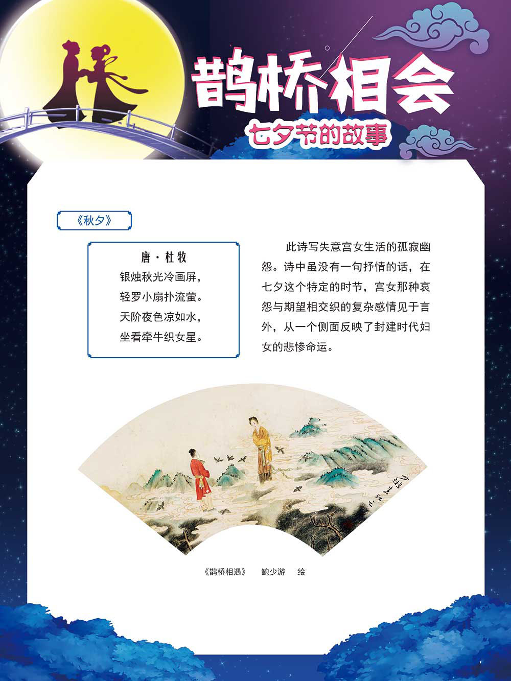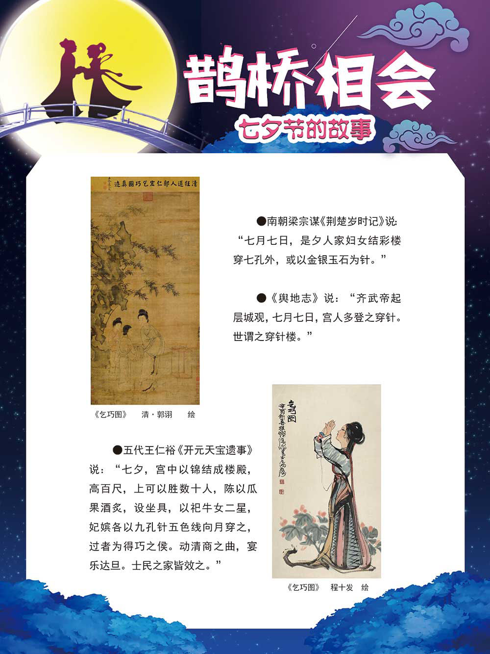 七夕节是中华民族重要的传统节日,在我国民间传统节日中是一个非常具有浪漫色彩的节日。自牛郎织女传说融入七夕节后,牛郎织女鹊桥相会的爱情故事流传千古,深入人心,这也就成为七夕节的主要内容。 2006年七夕节被国务院列入第一批国家级非物质文化遗产名录。“七夕节”是世界上最早的爱情节日,其体现的自由浪漫的爱情观、勤奋朴实的劳动观以及诠释的爱情永恒主题,彰显了传统文化的魅力。七夕文化中的乞巧、祈福活动体现了中华民族勤劳智慧、自强不息、勇于创造,不断追求更加幸福美好生活的精神。 本展览通过国画、连环画、摄影图像和七夕相关的诗歌等内容为您综合介绍七夕节文化内涵,以及民间的各种习俗和当下七夕节的传承和发展。