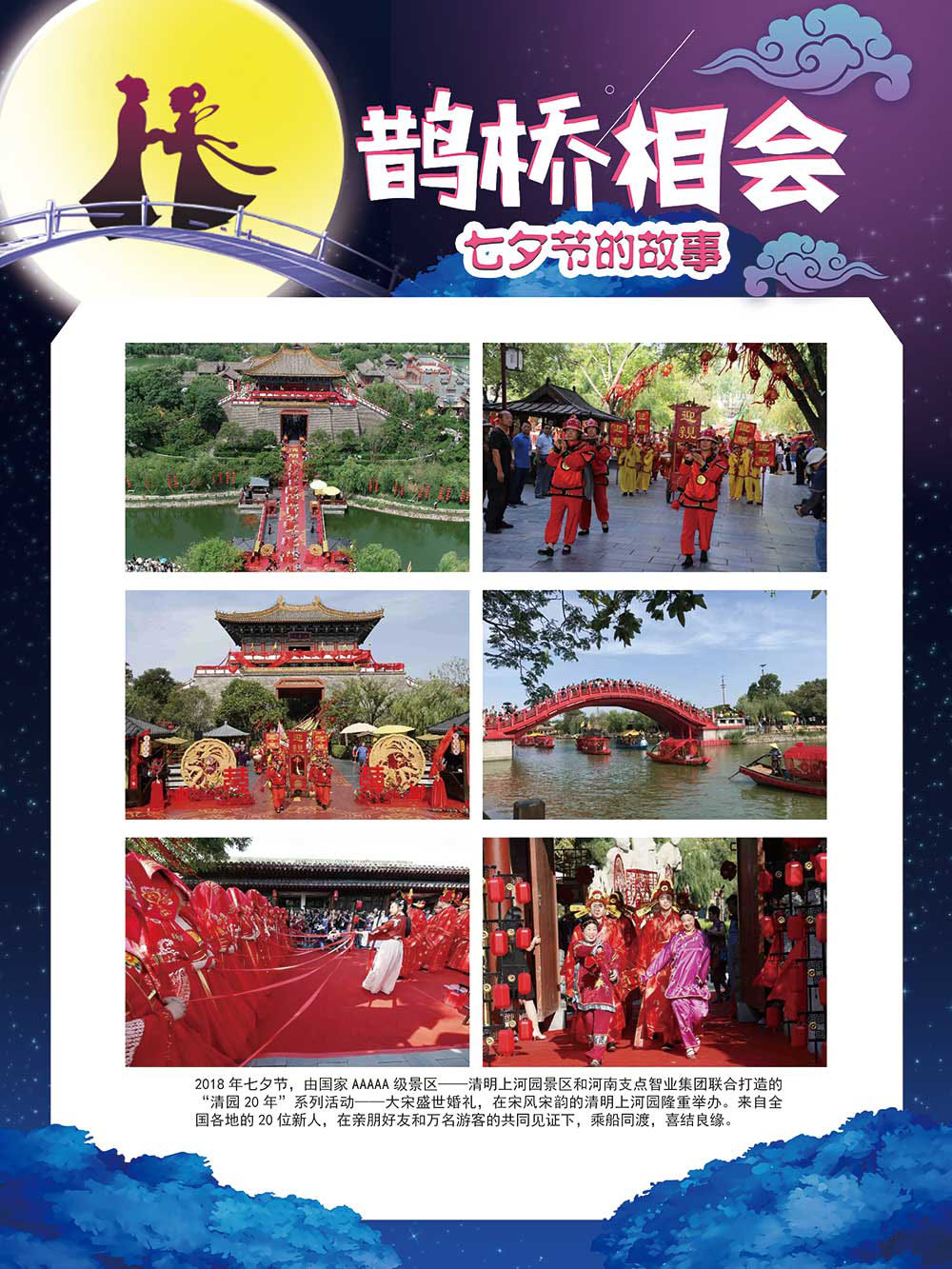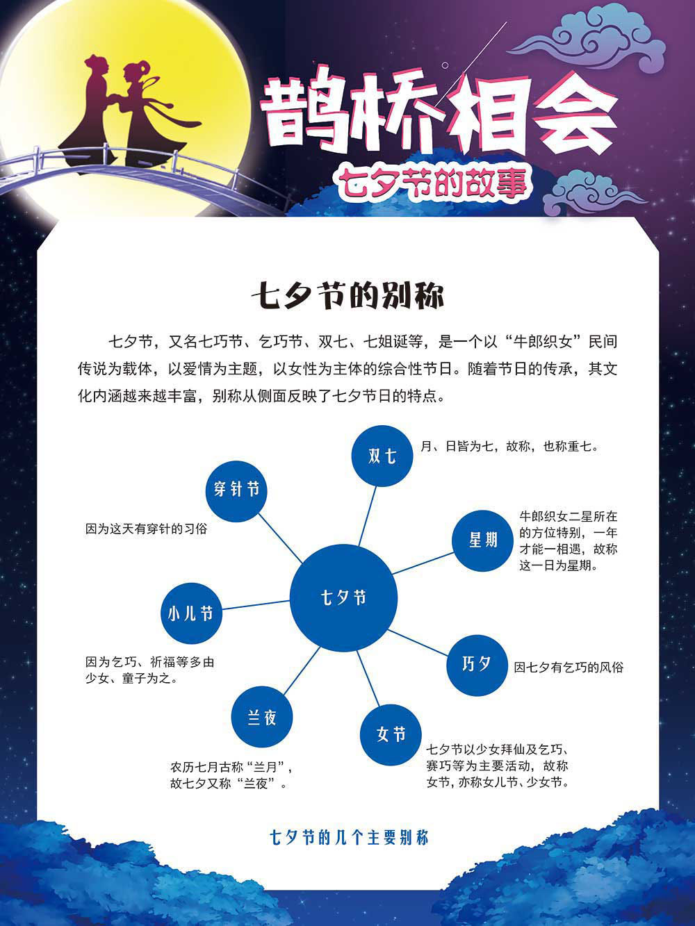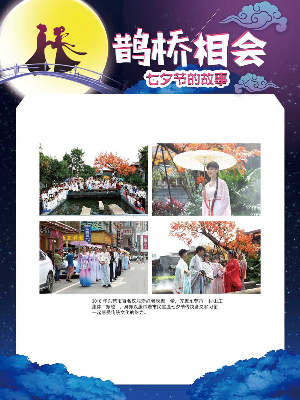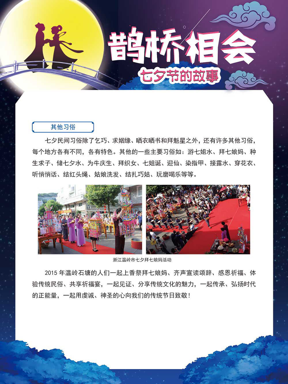 七夕节是中华民族重要的传统节日,在我国民间传统节日中是一个非常具有浪漫色彩的节日。自牛郎织女传说融入七夕节后,牛郎织女鹊桥相会的爱情故事流传千古,深入人心,这也就成为七夕节的主要内容。 2006年七夕节被国务院列入第一批国家级非物质文化遗产名录。“七夕节”是世界上最早的爱情节日,其体现的自由浪漫的爱情观、勤奋朴实的劳动观以及诠释的爱情永恒主题,彰显了传统文化的魅力。七夕文化中的乞巧、祈福活动体现了中华民族勤劳智慧、自强不息、勇于创造,不断追求更加幸福美好生活的精神。 本展览通过国画、连环画、摄影图像和七夕相关的诗歌等内容为您综合介绍七夕节文化内涵,以及民间的各种习俗和当下七夕节的传承和发展。