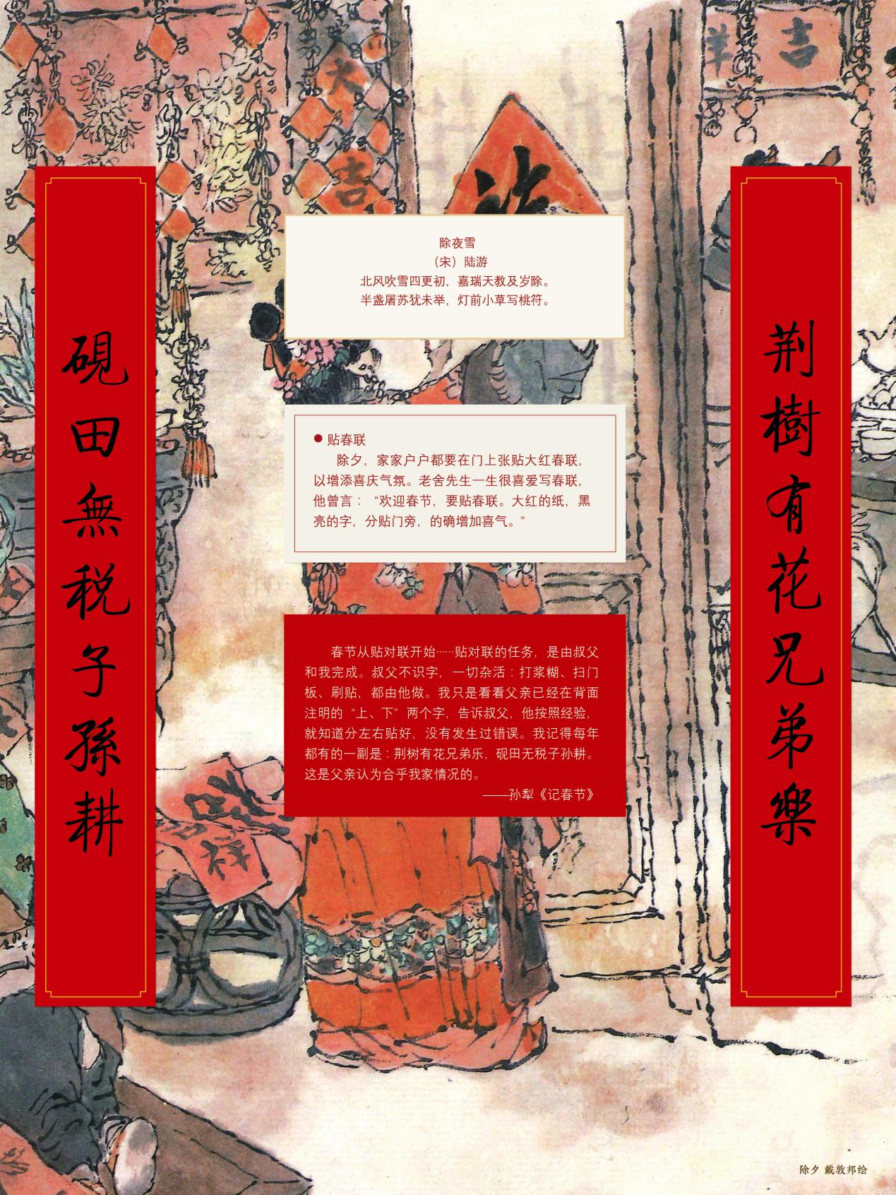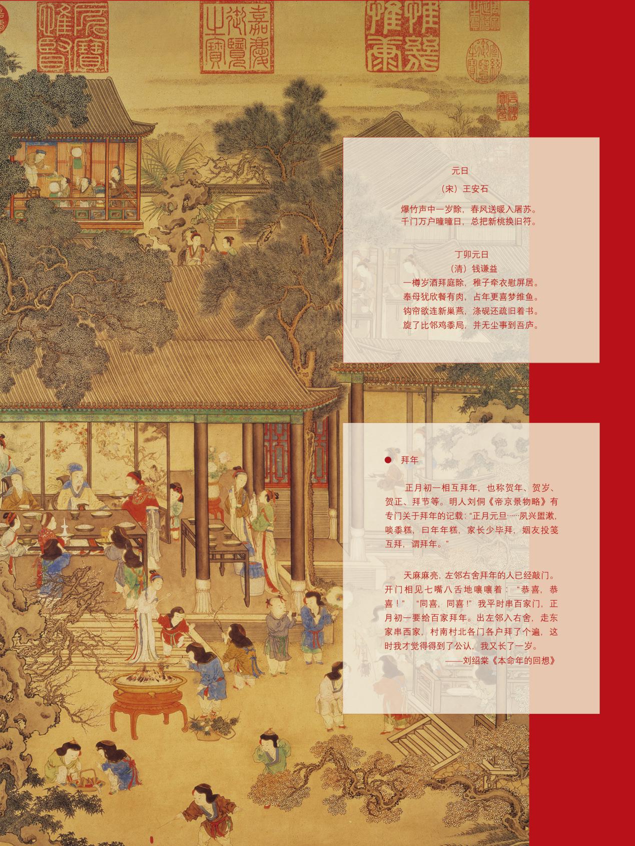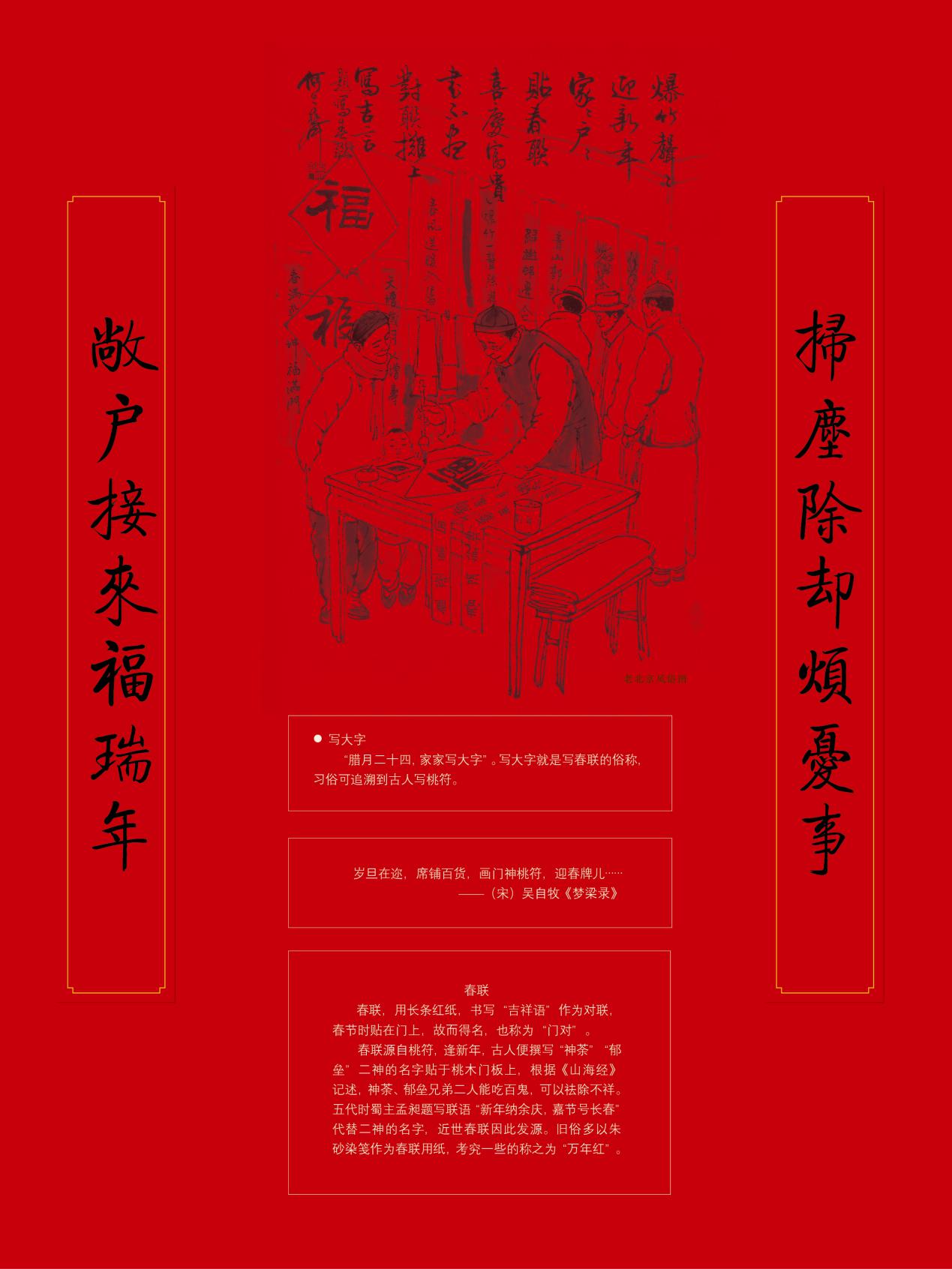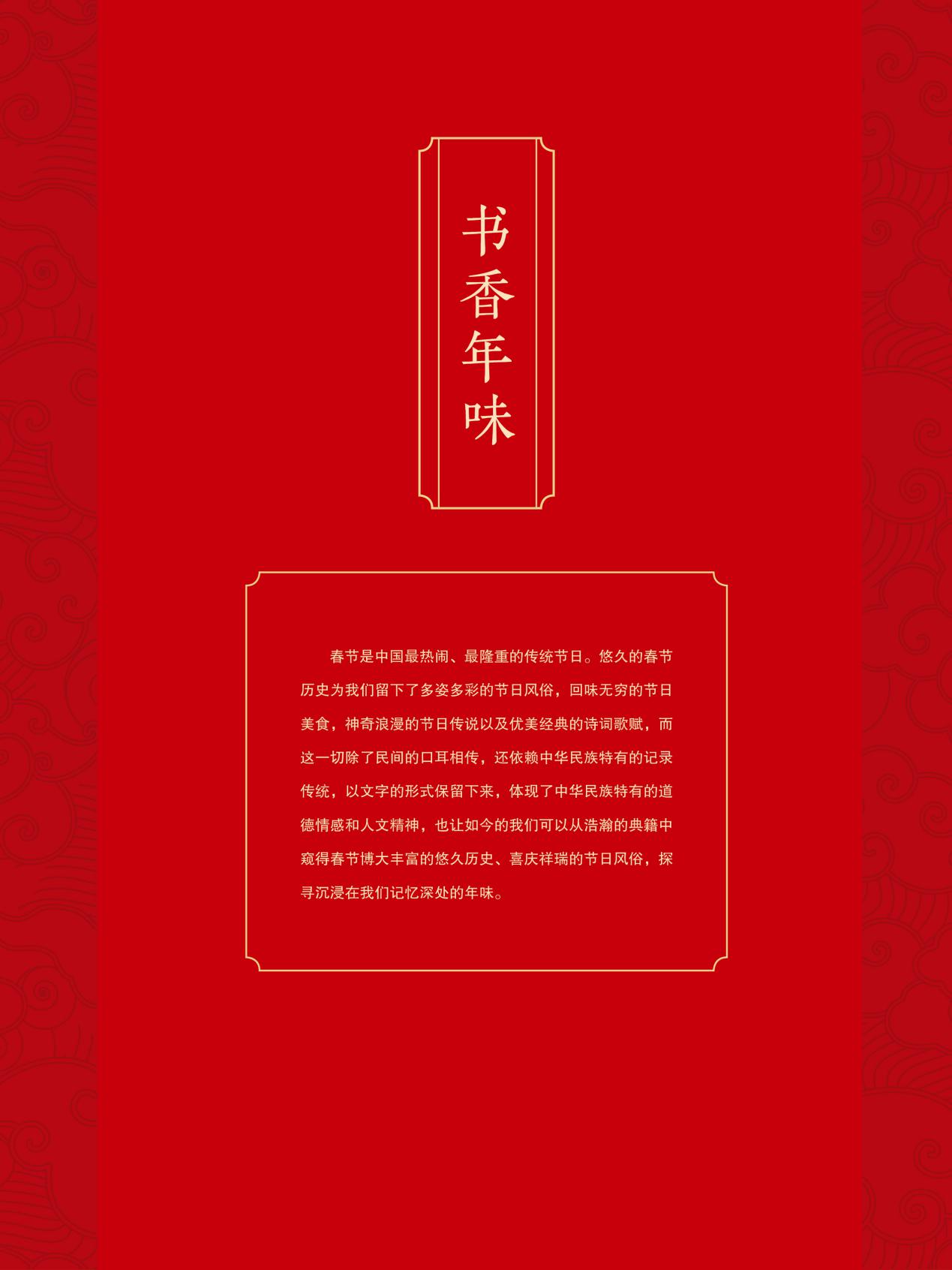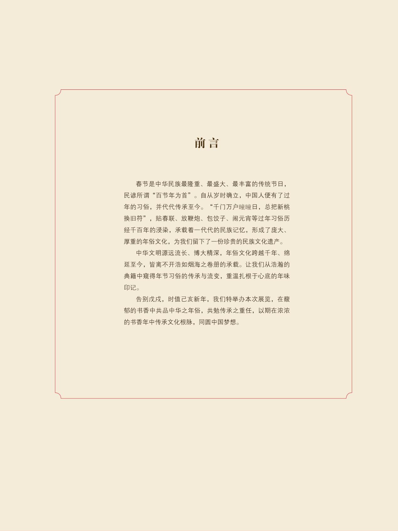 春节是中华民族最隆重、最盛大、最丰富的传统节日,民谚所谓“百节年为首”。自从岁时确立,中国人便有了过年的习俗,并代代传承至今。“千门万户瞳瞳日, 总把新桃换旧符”,贴春联、放鞭炮、包饺子、闹元宵等过年习俗历经千百年的浸染,承载着一代代的民族记忆, 形成了庞大、厚重的年俗文化,为我们留下了一份珍贵的民族文化遗产。 中华文明源远流长、博大精深,年俗文化跨越千年、绵延至今,皆离不开浩如烟海之卷册的承载。让我们从浩瀚的典籍中窥得年节习俗的传承与流变,重温扎根于心底的年味印记。 告别戊戌,时值己亥新年,我们特举办本次展览,在馥郁的书香中共品中华之年俗,共勉传承之重任,以期在浓浓的书香年中传承文化根脉,同圆中国梦想。