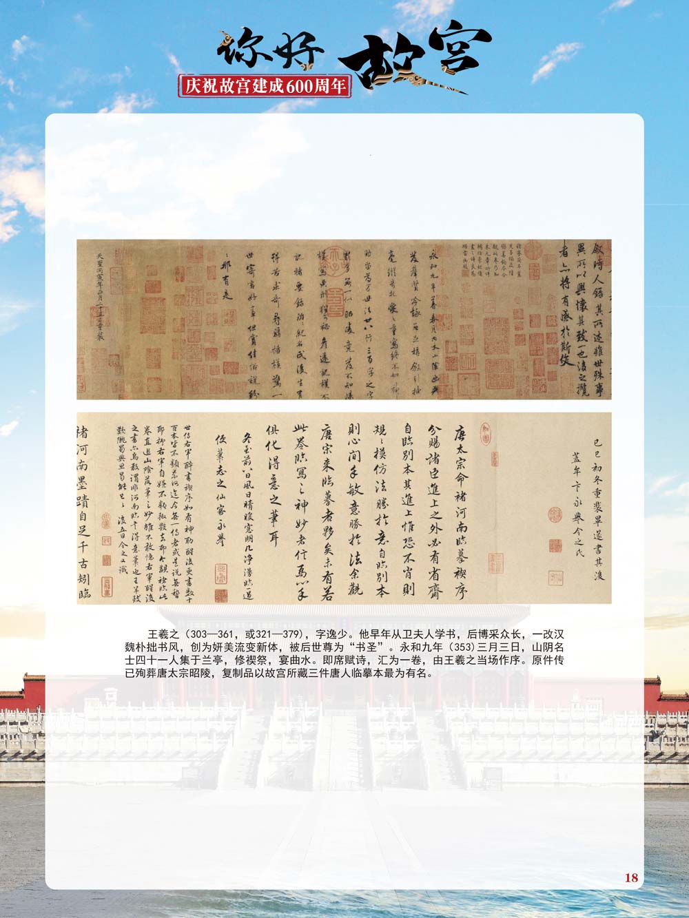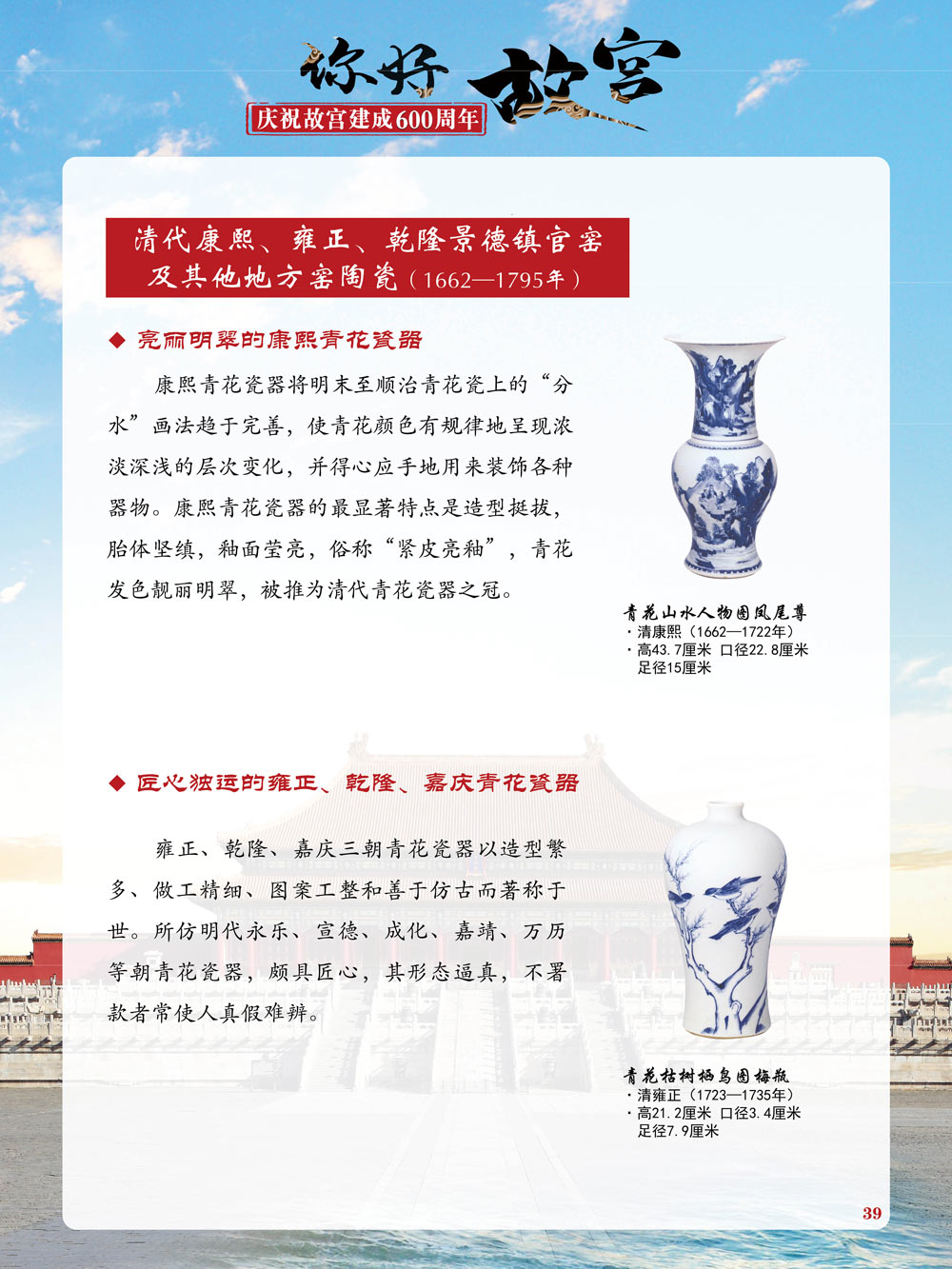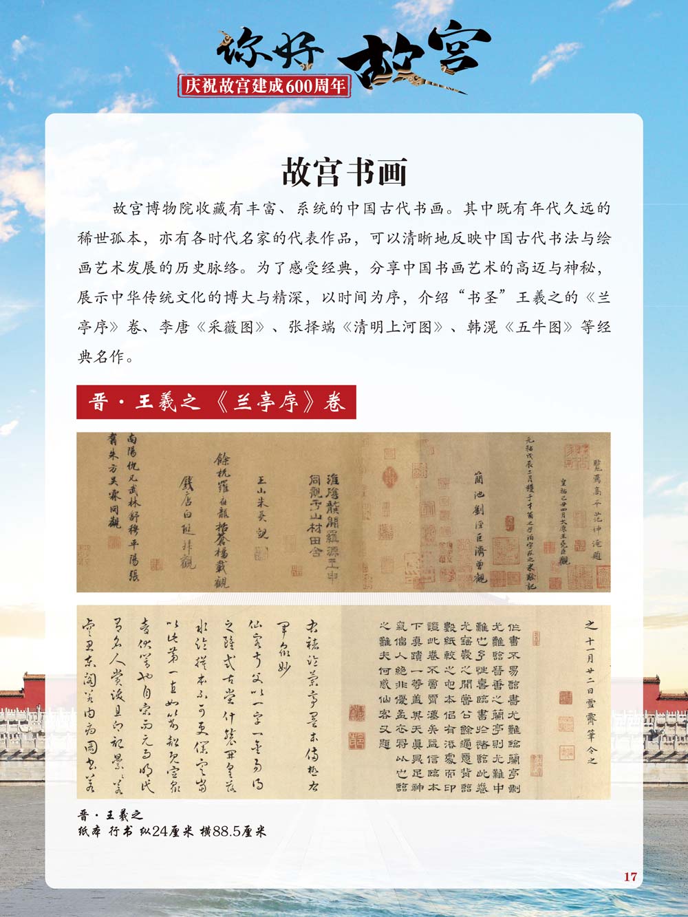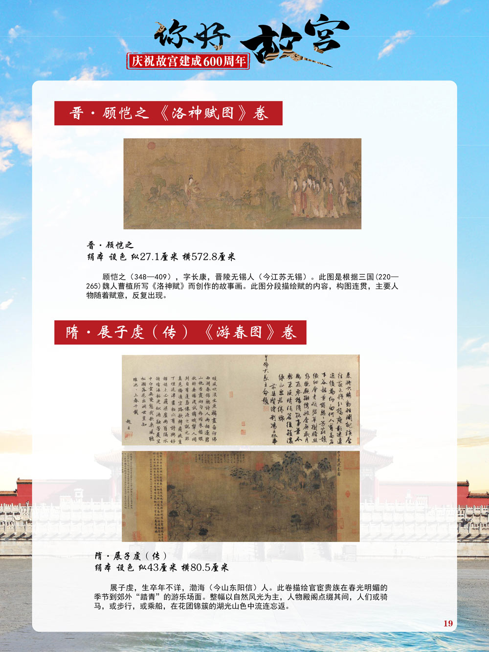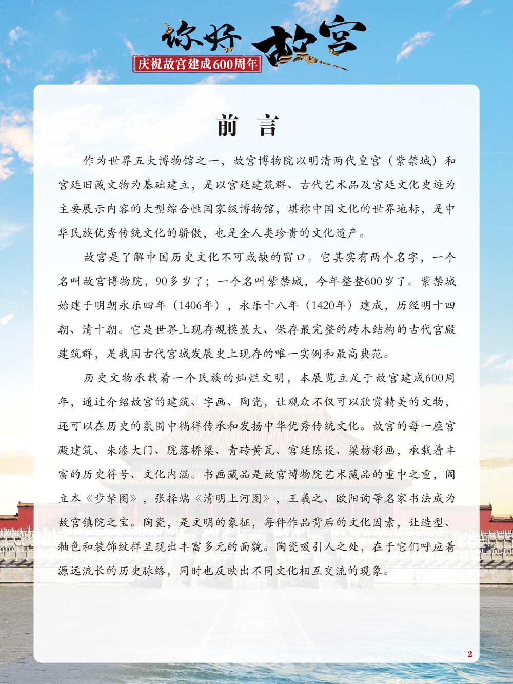 故宫是了解中国历史文化不可或缺的窗口。它其实有两个名字,一个名叫故宫博物院,90多岁了;一个名叫紫禁城,今年整整600岁了。 历史文物承载着一个民族的灿烂文明,本展览立足于故宫建成600周年,通过介绍故宫的建筑、字画、陶瓷,让观众不仅可以欣赏精美的文物,还可以在历史的氛围中徜徉传承和发扬中华优秀传统文化。故宫的每一座宫殿建筑、朱漆大门、院落桥梁、青砖黄瓦、宫廷陈设、梁枋彩画,承载着丰富的历史符号、文化内涵。书画藏品是故宫博物院艺术藏品的重中之重,阎立本《步辇图》,张择端《清明上河图》,王羲之、欧阳询等名家书法成为故宫镇院之宝。陶瓷,是文明的象征,每件作品背后的文化因素,让造型、釉色和装饰纹样呈现出丰富多元的面貌。陶瓷吸引人之处,在于它们呼应着源远流长的历史脉络,同时也反映出不同文化相互交流的现象。