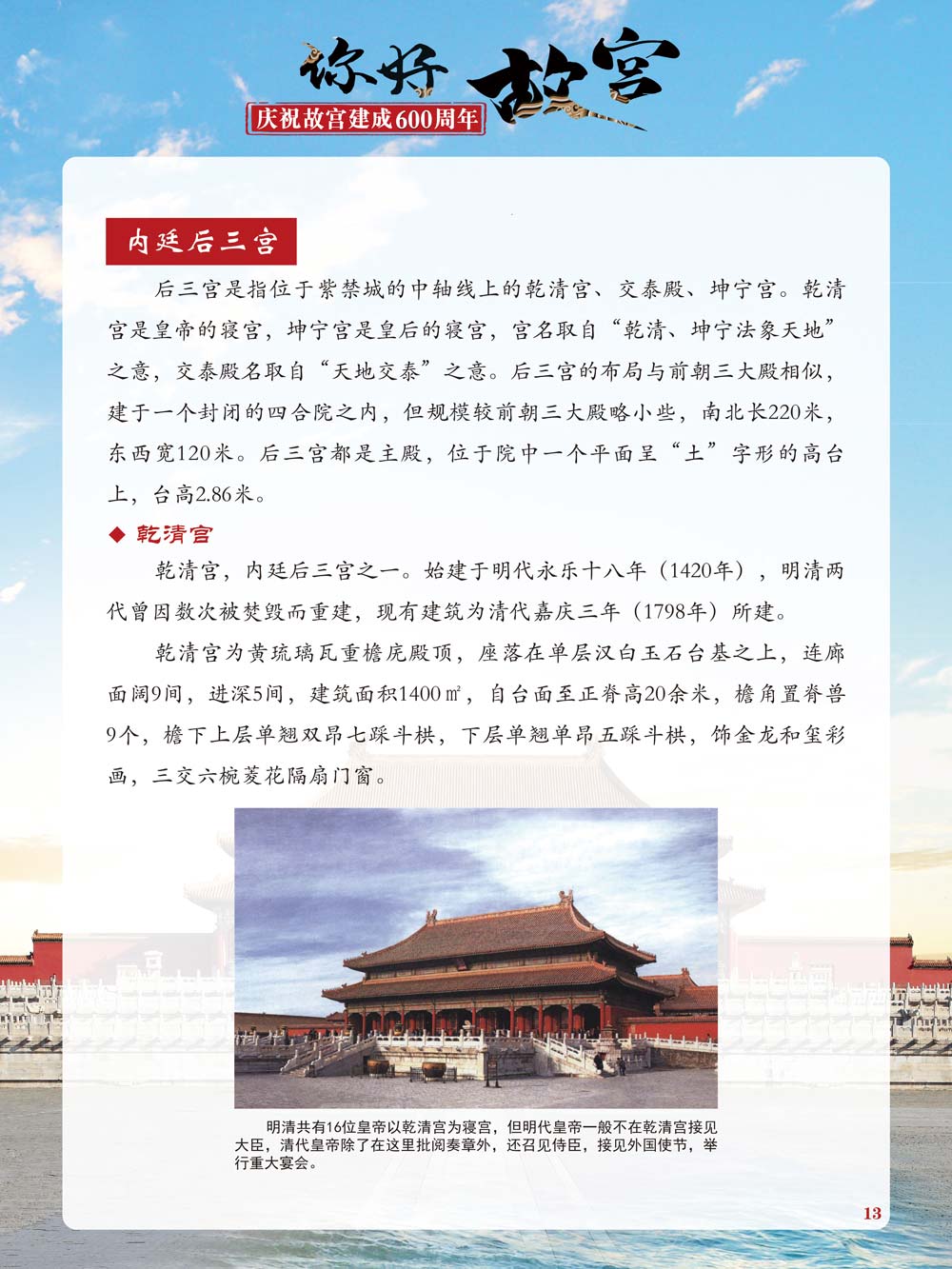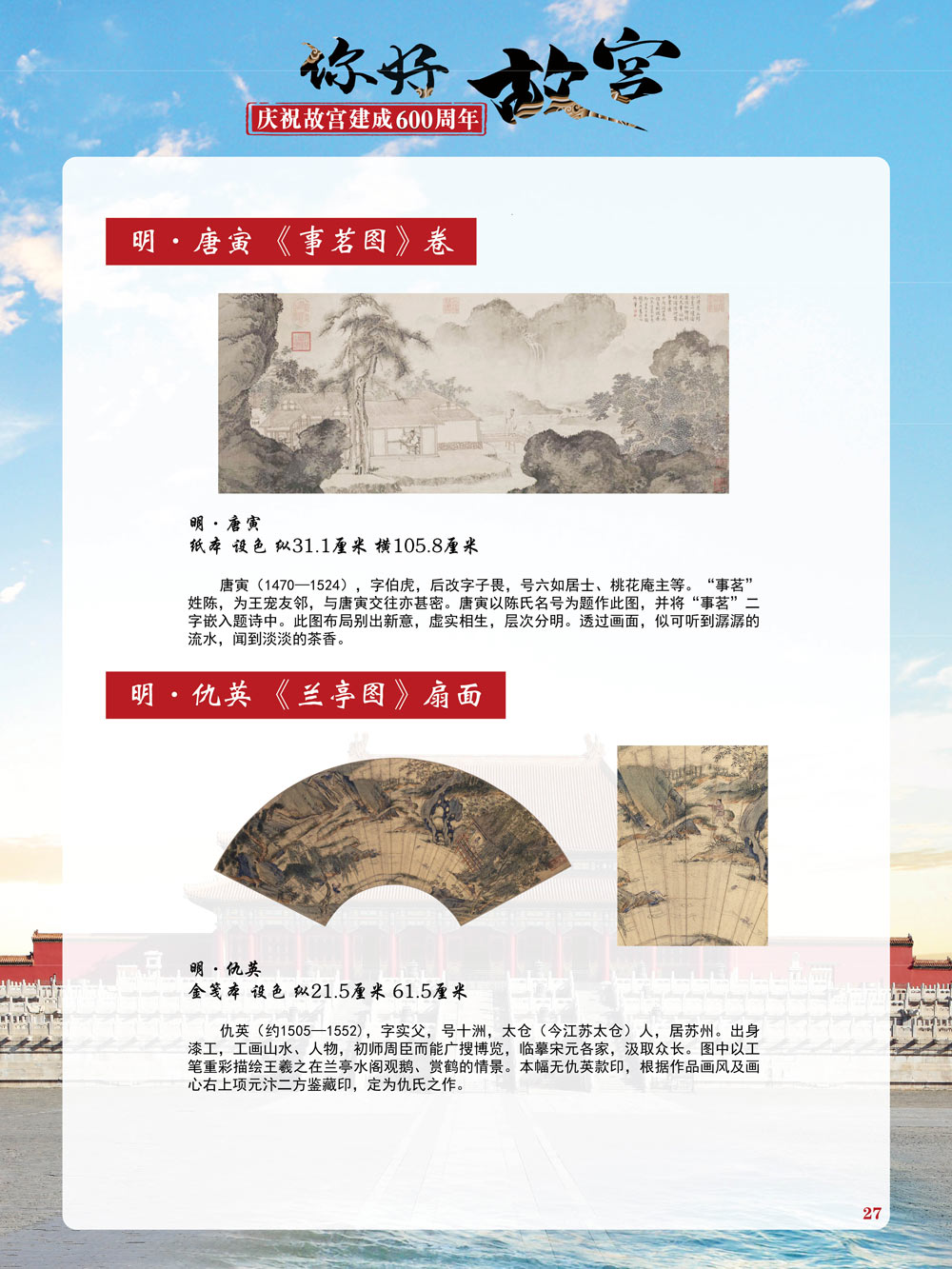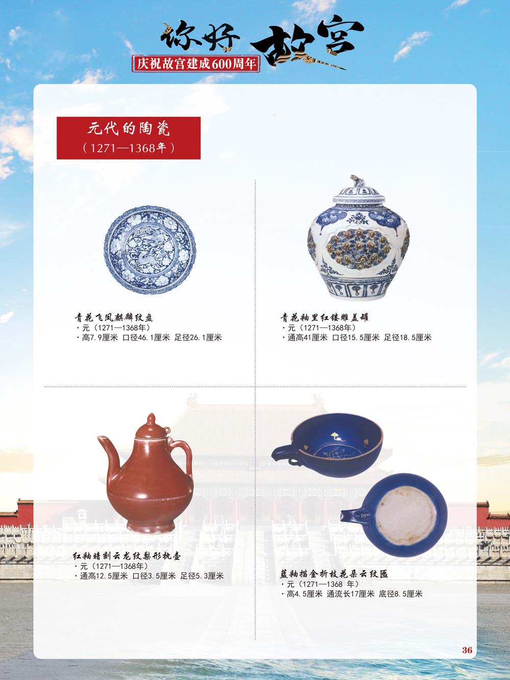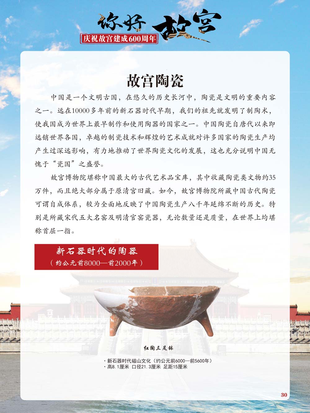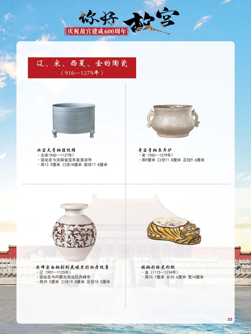 故宫是了解中国历史文化不可或缺的窗口。它其实有两个名字,一个名叫故宫博物院,90多岁了;一个名叫紫禁城,今年整整600岁了。 历史文物承载着一个民族的灿烂文明,本展览立足于故宫建成600周年,通过介绍故宫的建筑、字画、陶瓷,让观众不仅可以欣赏精美的文物,还可以在历史的氛围中徜徉传承和发扬中华优秀传统文化。故宫的每一座宫殿建筑、朱漆大门、院落桥梁、青砖黄瓦、宫廷陈设、梁枋彩画,承载着丰富的历史符号、文化内涵。书画藏品是故宫博物院艺术藏品的重中之重,阎立本《步辇图》,张择端《清明上河图》,王羲之、欧阳询等名家书法成为故宫镇院之宝。陶瓷,是文明的象征,每件作品背后的文化因素,让造型、釉色和装饰纹样呈现出丰富多元的面貌。陶瓷吸引人之处,在于它们呼应着源远流长的历史脉络,同时也反映出不同文化相互交流的现象。