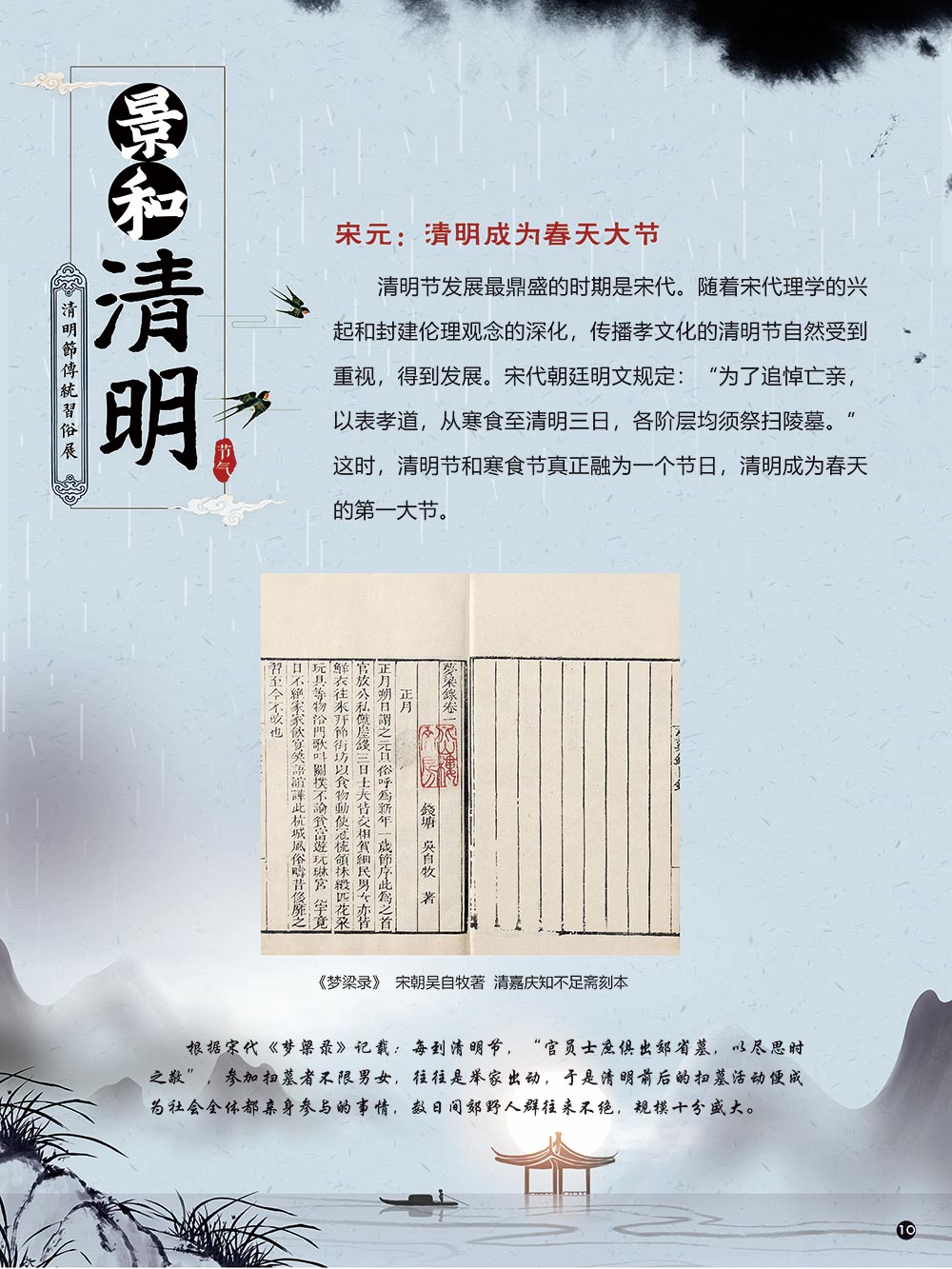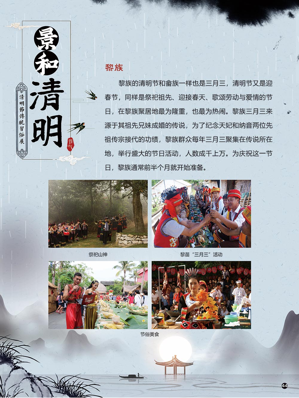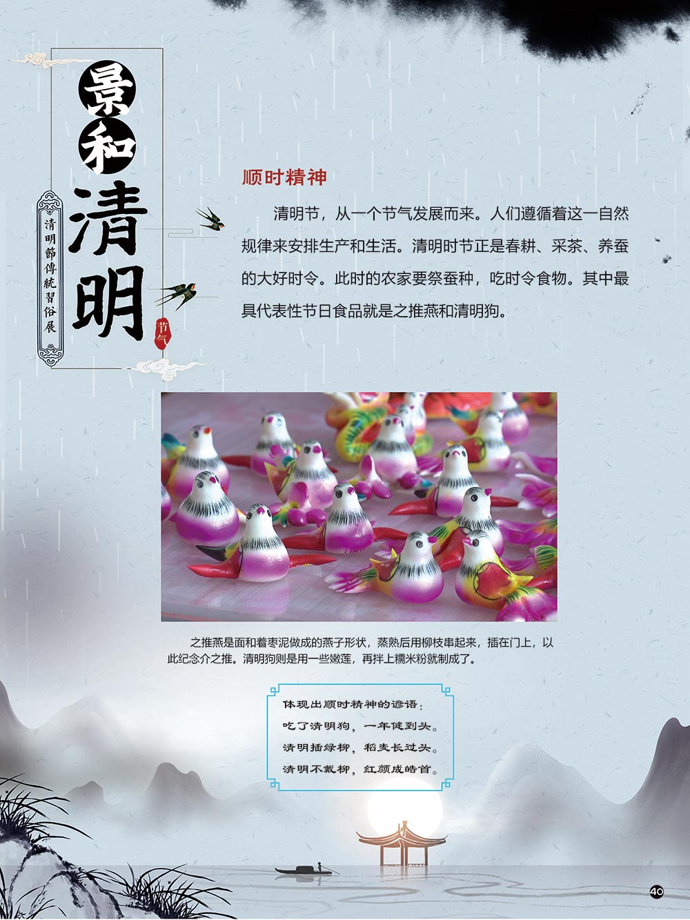 清明节是中华民族传统节日中一个由节气命名的节日。清明节的文化内涵传承着中华民族独特的精神与情感。古往今来,清明节作为中国忠孝文化的载体,对家庭的尊崇,对祖先的感恩,对血脉责任的认同,使其在我国民俗节日体系中具有不可替代的地位。 清明节蕴含着我国优秀的民族文化,承载着我国民众的伦理观念、审美情趣、道德信仰和社会风俗。 在上千年的历史发展中,清明节这一古老的传统节日,随时代而变化。尤其是在当今社会,清明节的发展呈现出新态势。如政府组织学校或单位在清明节去革命烈士陵园扫墓,缅怀为新中国浴血奋战的革命先烈;数以万计的海外侨胞在清明节回国,祭拜人类始祖轩辕黄帝。 2006年5月20日,文化部申报的清明节经国务院批准列入第一批国家级非物质文化遗产名录。清明节习俗甚多,全国各地因地域文化不同而又存在着习俗内容上或细节上的差异,各地习俗虽不尽相同,但扫墓祭祖、踏青郊游是共同的基本节俗主题。展览主要介绍清明节的起源及发展和习俗文化,以此讲述清明节日故事,弘扬传统文化。