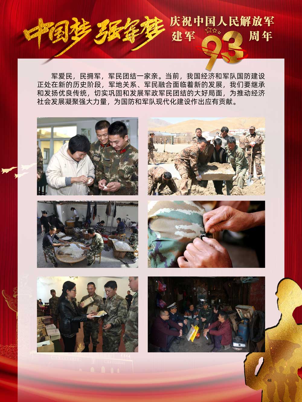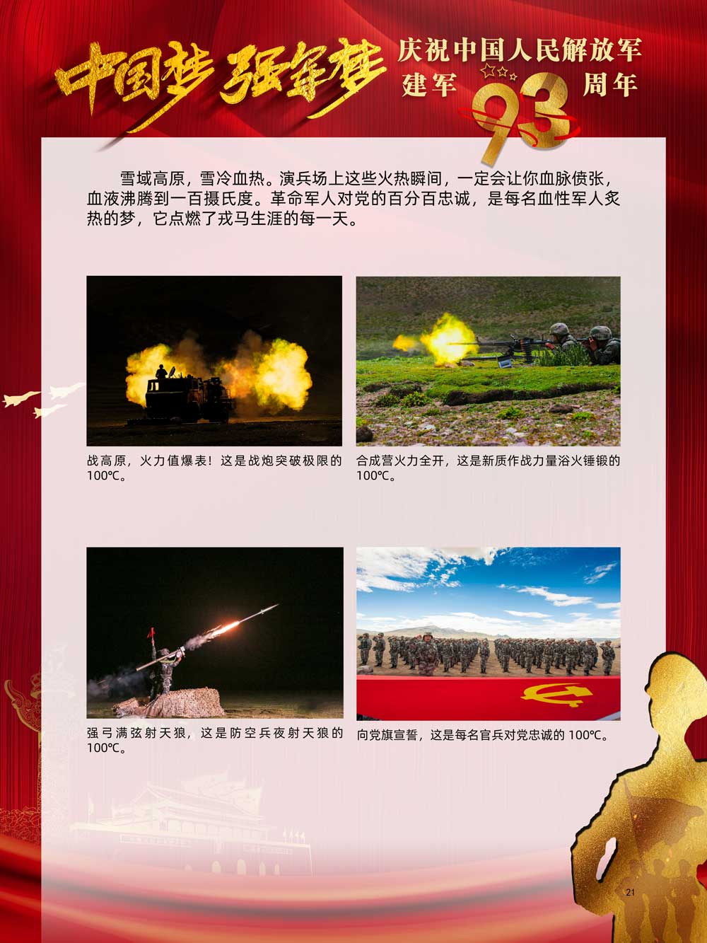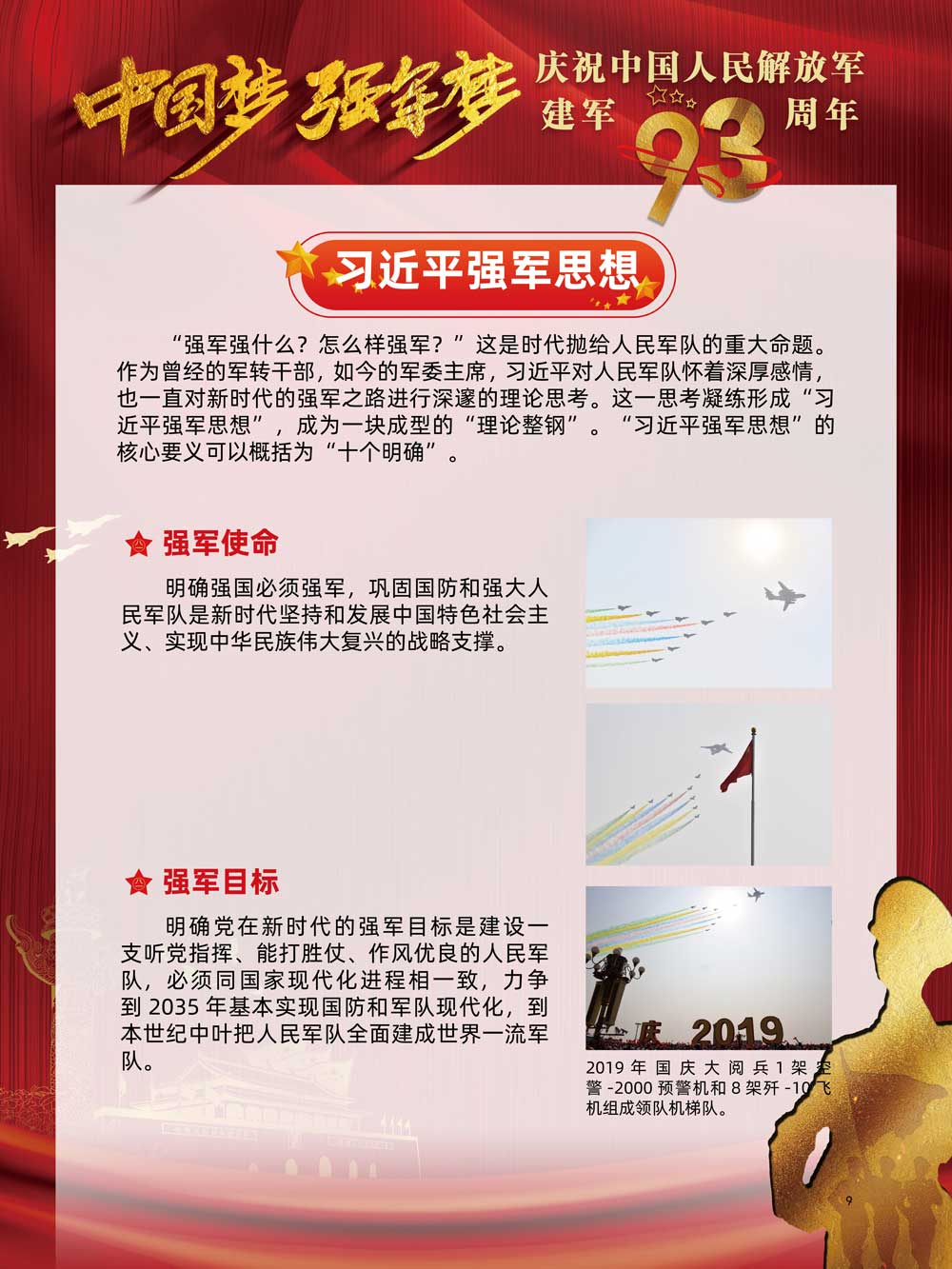 中国梦,强军梦。同根生,同心圆。 在十九大报告中有一句重要的表述,实现中国梦强军梦,把中国梦和强军梦放在一起表述和推进。在新时代国家安全形势面临着复杂严峻的局面,我们要实现中华民族伟大复兴的中国梦,对安全需求、安全保障提出了更高的要求。在这样一个背景下,建设强大军队的历史任务就前所未有地提出了。 中国梦和强军梦,是相互支持、相互支撑的关系。中国梦为强军梦提供强大的支撑,因为我们国家如果不能富强,我们就不可能有足够的资源来用于国防和军队建设。所以建设一支强大的军队必须要以中国梦的实现、要以国家的富强来作为前提,只有“富国强军”,中国梦最终才能实现。强军是中华民族伟大复兴的重要基石。富国和强军是中华民族伟大复兴的两大基石。富国是强军的基本依托,强军是富国的安全保障。强军梦不圆,中国梦也难圆。雄厚的经济实力是一个国家强大的基础,但倘若没有相应的国防实力和军事能力作后盾,经济实力再强大也不能成就真正意义上的中国梦。 今年是中国人民解放军建军93年,为庆祝中国人民解放军建军93周年,我们特别策划本展览,向您介绍中国梦强军梦的理论关系,介绍习近平强军的思想,向您展示中国人民解放军刻苦训练的飒爽英姿和自主创新的国产武器,以及其乐融融的军民鱼水情。