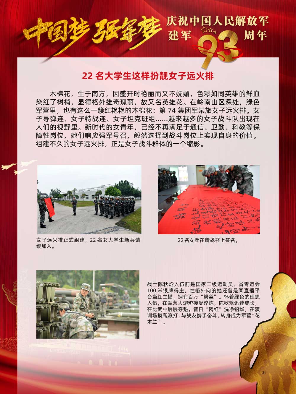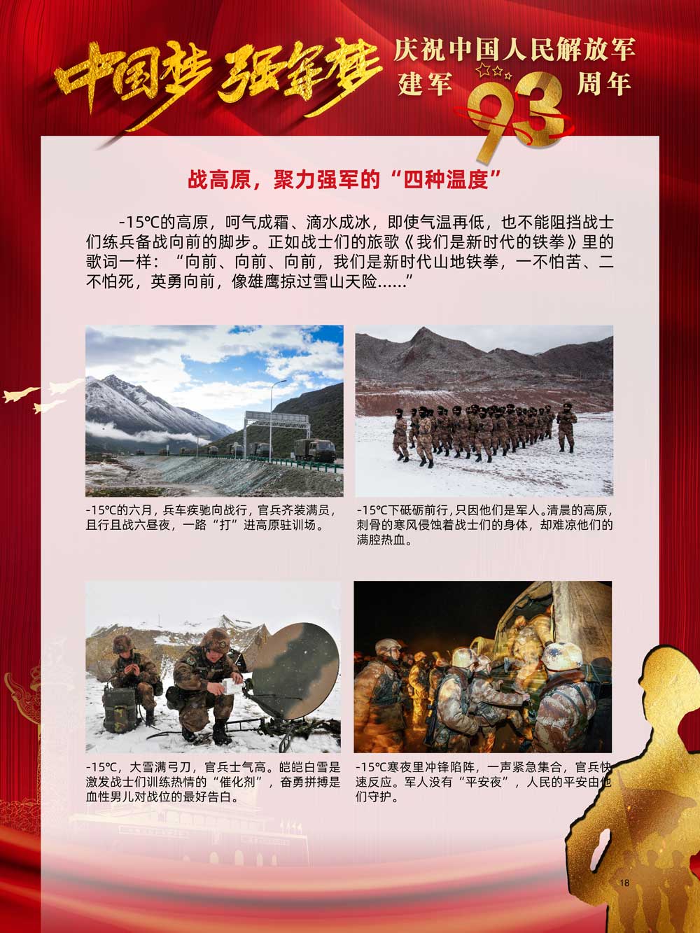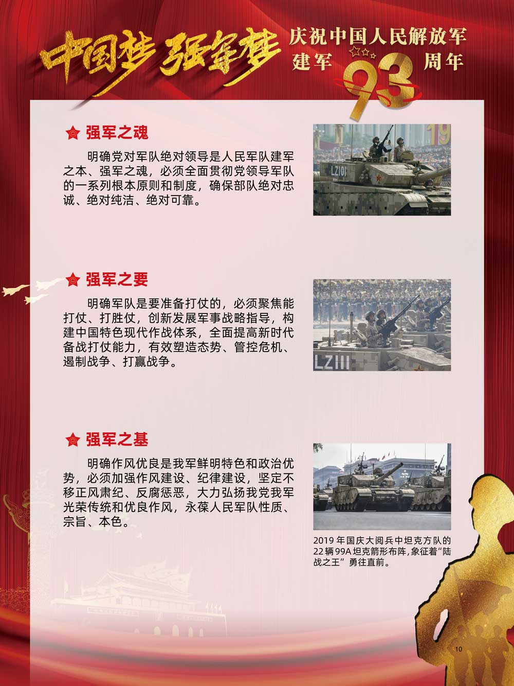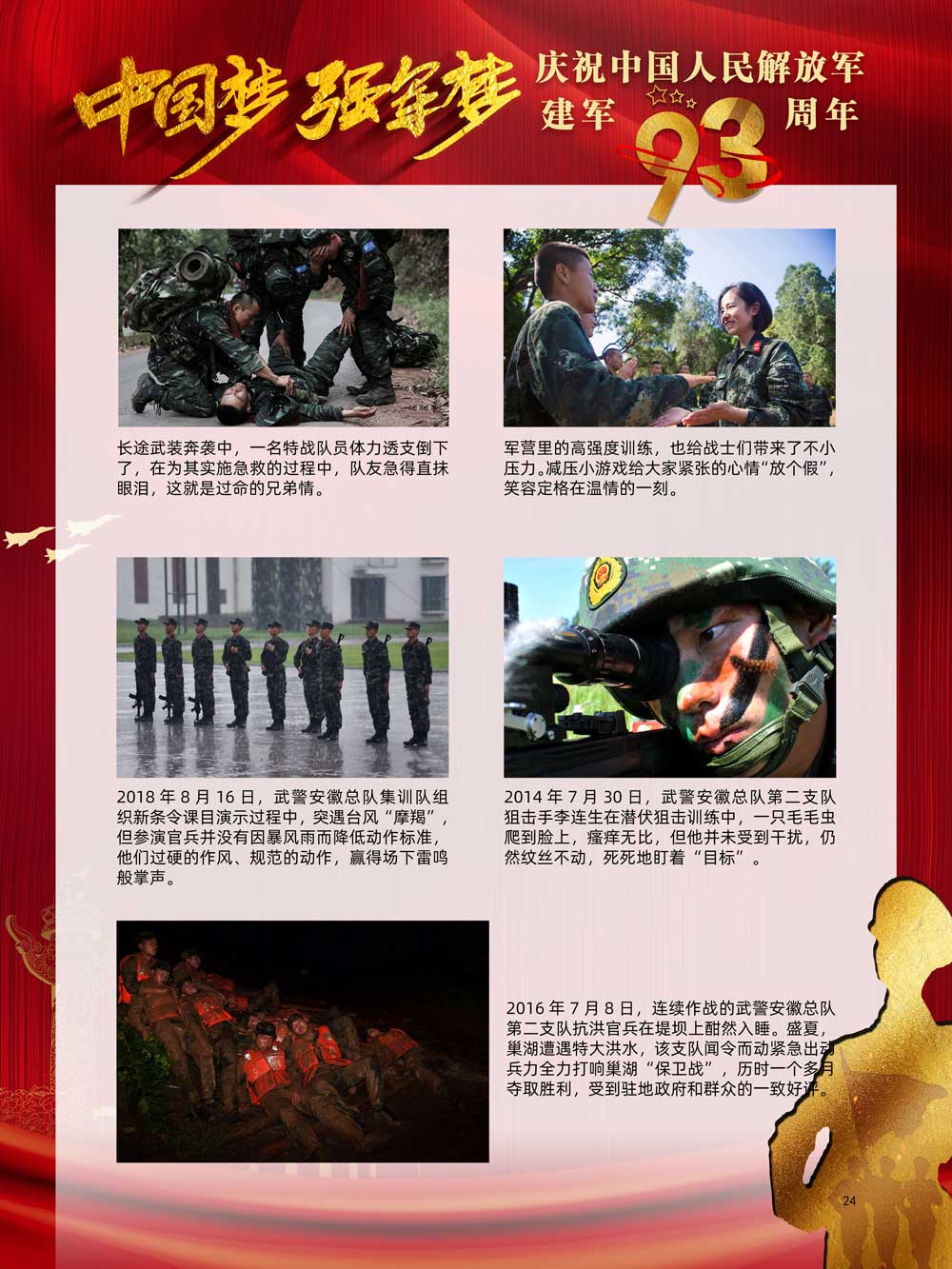 中国梦,强军梦。同根生,同心圆。 在十九大报告中有一句重要的表述,实现中国梦强军梦,把中国梦和强军梦放在一起表述和推进。在新时代国家安全形势面临着复杂严峻的局面,我们要实现中华民族伟大复兴的中国梦,对安全需求、安全保障提出了更高的要求。在这样一个背景下,建设强大军队的历史任务就前所未有地提出了。 中国梦和强军梦,是相互支持、相互支撑的关系。中国梦为强军梦提供强大的支撑,因为我们国家如果不能富强,我们就不可能有足够的资源来用于国防和军队建设。所以建设一支强大的军队必须要以中国梦的实现、要以国家的富强来作为前提,只有“富国强军”,中国梦最终才能实现。强军是中华民族伟大复兴的重要基石。富国和强军是中华民族伟大复兴的两大基石。富国是强军的基本依托,强军是富国的安全保障。强军梦不圆,中国梦也难圆。雄厚的经济实力是一个国家强大的基础,但倘若没有相应的国防实力和军事能力作后盾,经济实力再强大也不能成就真正意义上的中国梦。 今年是中国人民解放军建军93年,为庆祝中国人民解放军建军93周年,我们特别策划本展览,向您介绍中国梦强军梦的理论关系,介绍习近平强军的思想,向您展示中国人民解放军刻苦训练的飒爽英姿和自主创新的国产武器,以及其乐融融的军民鱼水情。