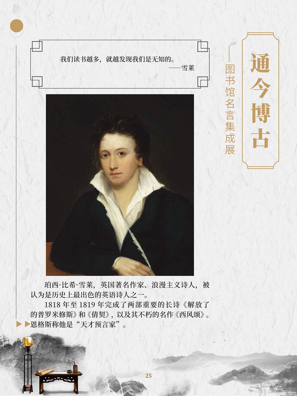 名人名言是人类思想的精华,智慧的结晶。面对书海浩瀚,语林苍茫,感悟名人名言,对于每个人来说,都是明智的选择。一句句铿锵有力的名言,就是一个个思想火花,可以点燃青春的热情,激发人们的奋斗精神;一句句闪烁着智慧光芒的名人名言,就像一座座人生的灯塔,照耀着人们前进的道路。 在2020年“4·23世界读书日”来临之际,为了倡导全民阅读,引导广大群众逐步形成爱读书、多读书、读好书的阅读习惯,特举办此展览。展览以“读书与学习”为主题的名人名言为主线,让广大观众领略古今中外名人名言的内涵和风采。 “最是书香能致远,唯有读书方宁静”,建设学习型社会应该从阅读开始。一个善于阅读的人一定会成为有前途的人,一个善于阅读的民族一定会成为有希望的民族,一个善于阅读的国家一定会成为不断发展壮大的国家!
