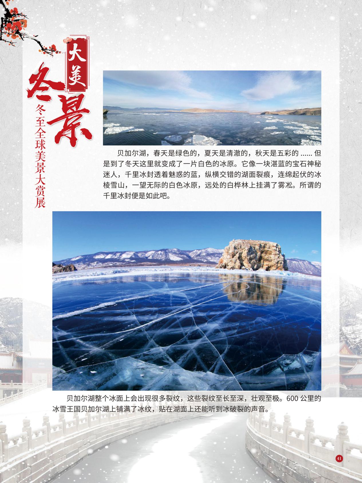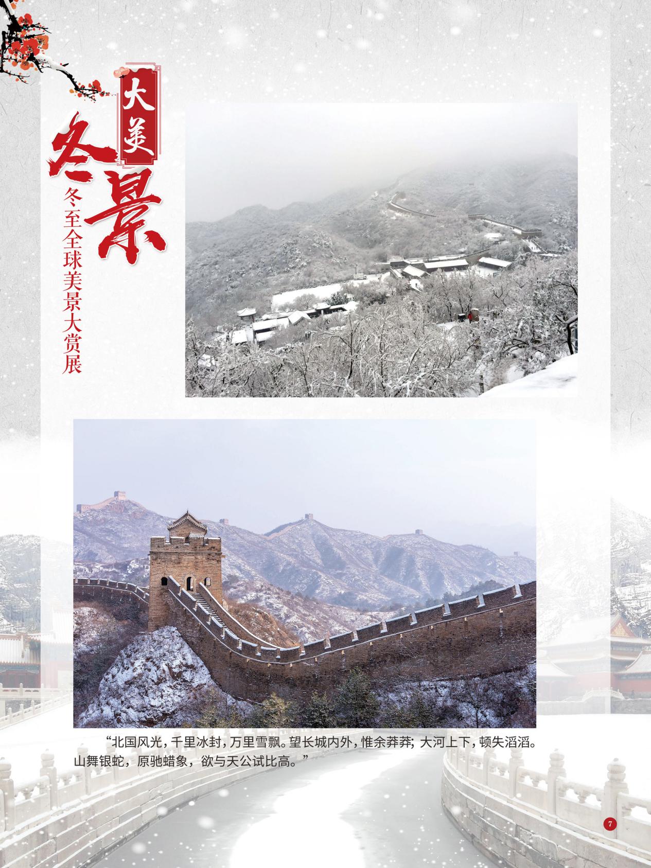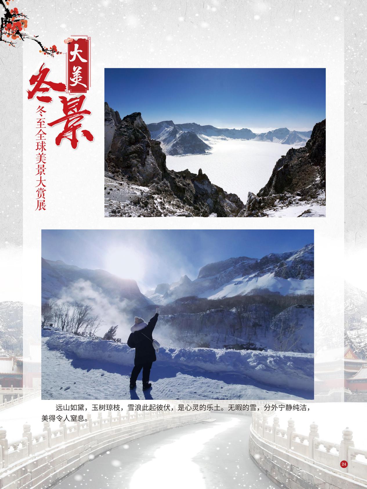 冬至是中国民间的传统节日,于每年公历12月21日至23日交节。冬至是四时八节之一,被视为冬季的大节日,在古代民间有“冬至大如年”的讲法,所以古人称冬至为“亚岁”或“小年”。冬至兼具自然与人文两大内涵,是二十四节气中一个重要的节气。 冰雪,是冬天谱写的一曲曲华丽乐章,是毛主席笔下的“北国风光,千里冰封,万里雪飘” ,是杜甫笔下的“窗含西岭千秋雪,门泊东吴万里船”, 是岑参笔下的“忽如一夜春风来,千树万树梨花开”,是柳宗元笔下的“孤舟蓑笠翁,独钓寒江雪”……地域不一样,冬天谱写的冰雪乐章也不一样,即便是同一处冰雪胜景,不同的人品出的也是不一样的味。冬天的美景是大自然的馈赠,本展览主要介绍冬至来临之后全球的冰雪美景奇观,带大家一起领略冬季的风采,探寻大自然的奥秘!