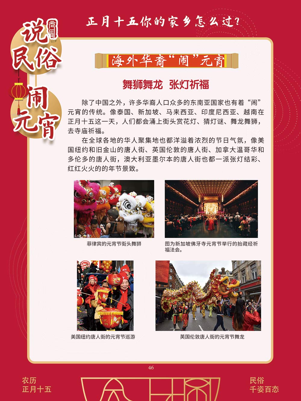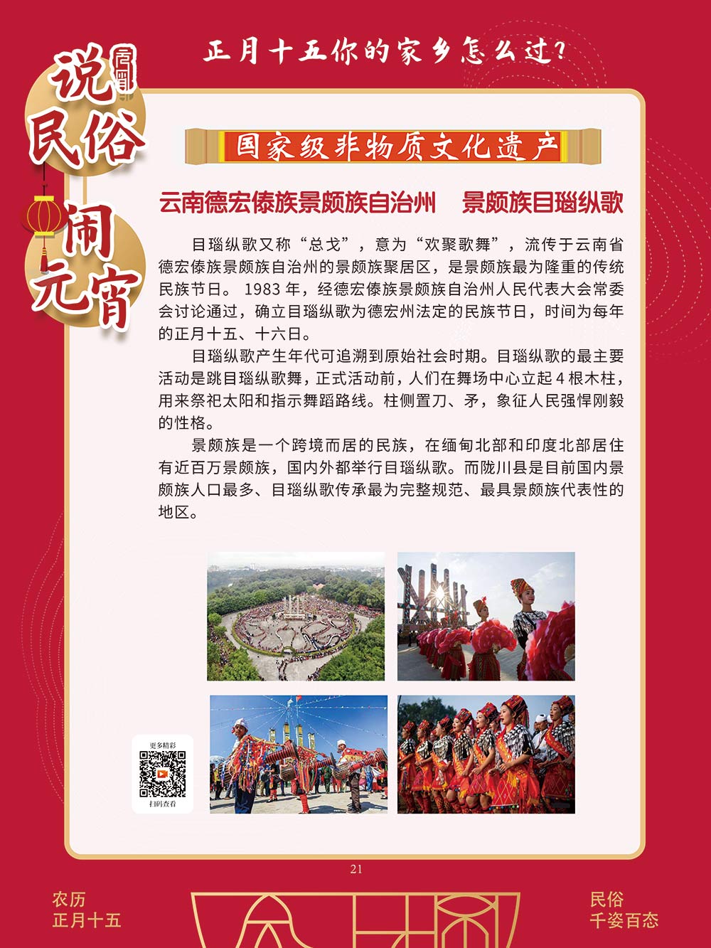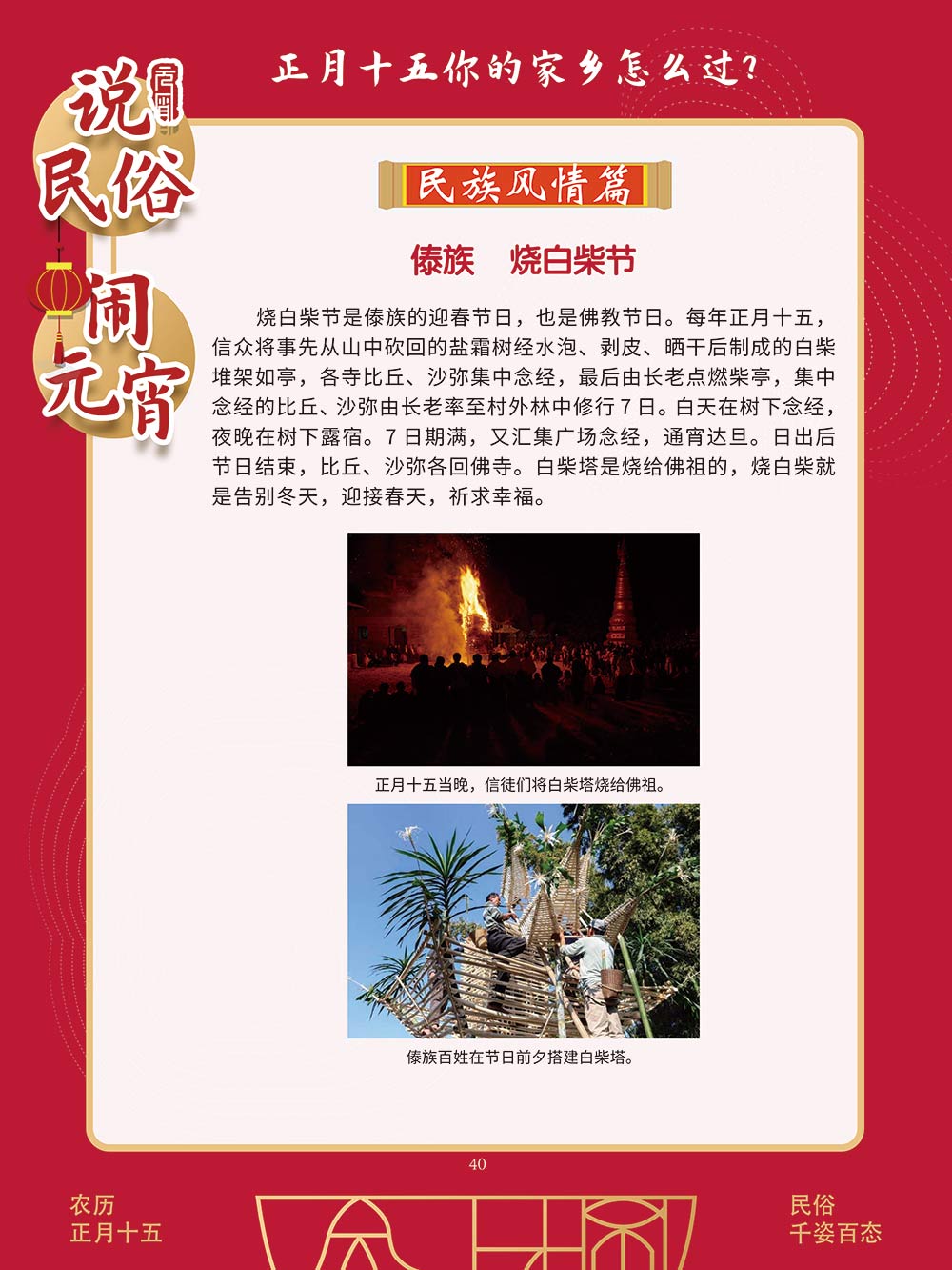 每年的正月十五这一天,赏花灯、猜灯谜、吃元宵、放烟花、耍龙灯、舞狮子、踩高跷、划旱船……这些衍生于汉民族传统习俗的节日活动接连上演,随处可见一派欢天喜地、热闹非凡。然而在幅员辽阔、地广物博的中华大地上,不同的民族和地域也形成了许多独具特色的元宵节习俗,其中很多都已被列为国家级非物质文化遗产。 这些从农耕文明孕育而来的岁时节俗,千百年来,孕育和滋养了博大而丰富的中国传统文化。它们经历了千百年漫长而复杂的发展变迁、代代相传,凝聚了中国劳动人民的智慧结晶,闪烁着中华民族的文明之光。 在西方节日流行的当下,我们对这些中华民族的灿烂民俗文化瑰宝又了解多少呢?是时候让灿烂的民俗真正“闹”起来,让传统节日融入当下的大众生活,在保留原有文化底蕴的基础上,从内容和形式上注入更符合现代潮流的创新元素,唤回年轻人们的关注。 正月十五你的家乡怎么过?不妨借此元宵佳节之际,让我们一起来说民族闹元宵,比一比究竟哪里的年味最浓!