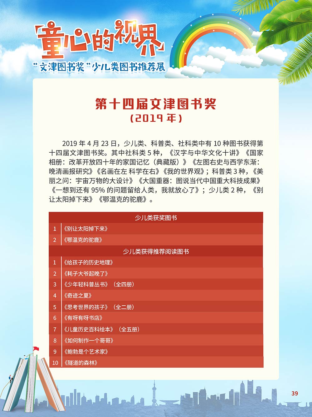 随着生活水平的日益提高,青少年儿童的阅读则更需要人们的引导和关注。特别是在信息爆炸的今天,如何为青少年儿童提供他们感兴趣的,有利于身心健康的、有利于知识增长的书籍,这是一个重要的问题。文津图书奖从2010年第七届开始,每年都会有少儿类图书评选,以及少儿类推荐阅读书籍,这无异于是为少年儿年儿童提供了宝贵的阅读书单。这些书的作者带着童心,以少年儿童的视角创作出来的书籍,更符合少年儿童的阅读和理解,是少年儿童理想的知识宝库。 在全民阅读浪潮席卷全国的今天,少年儿童阅读逐渐成为老师和家长们关注的话题。在儿童节到来之际,我们特别策划了《童心的视界——“文津图书奖”少儿类图书推荐展》,用图文并茂的方式展出第七届“文津图书奖”以来获奖的,或获得推荐阅读的少儿类书籍。优秀的孩子离不开阅读,希望通过这些“文津”好书,能打开孩子们的视野,能在书中领悟大千世界的美妙,能够看到更为广阔的世界,激发孩子们的阅读兴趣,从而享受到阅读的快乐、生活的快乐,争做新时代的好少年!