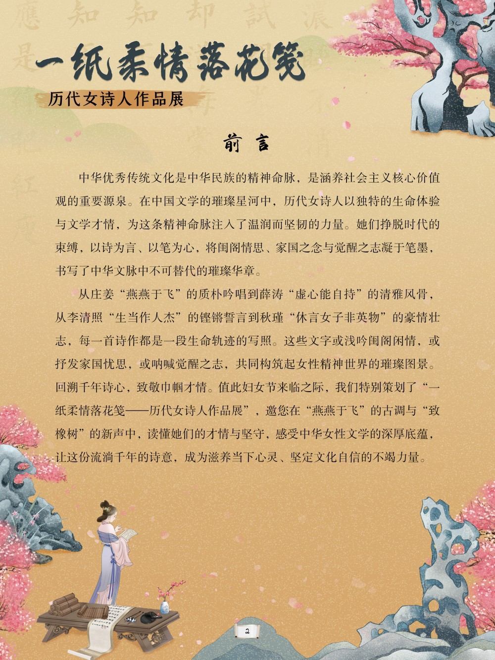 中华优秀传统文化是中华民族的精神命脉,是涵养社会主义核心价值观的重要源泉。在中国文学的璀璨星河中,历代女诗人以独特的生命体验与文学才情,为这条精神命脉注入了温润而坚韧的力量。她们挣脱时代的束缚,以诗为言、以笔为心,将闺阁情思、家国之念与觉醒之志凝于笔墨,书写了中华文脉中不可替代的璀璨华章。 从庄姜“燕燕于飞”的质朴吟唱到薛涛“虚心能自持”的清雅风骨,从李清照“生当作人杰”的铿锵誓言到秋瑾“休言女子非英物”的豪情壮志,每一首诗作都是一段生命轨迹的写照。这些文字或浅吟闺阁闲情,或抒发家国忧思,或呐喊觉醒之志,共同构筑起女性精神世界的璀璨图景。回溯千年诗心,致敬巾帼才情。 值此妇女节来临之际,我们特别策划了“一纸柔情落花笺——历代女诗人作品展”,邀您在“燕燕于飞”的古调与“致橡树”的新声中,读懂她们的才情与坚守,感受中华女性文学的深厚底蕴,让这份流淌千年的诗意,成为滋养当下心灵、坚定文化自信的不竭力量。 展览地点:济宁市图书馆二楼大厅 展览时间:即日起至3月31日
