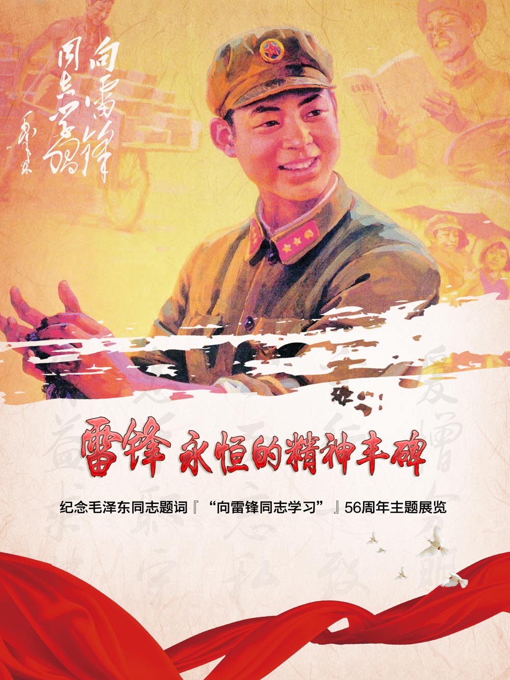 雷锋是在中国共产党和中国人民培育下成长起来的伟大的共产主义战士,是社会主义时期优秀青年的杰出代表,是全国人民学习的光辉榜样。 雷锋的一生平凡而伟大。他爱党、爱国、爱社会主义的坚定信念,全心全意为人民服务、无私奉献的高尚风格,千一行、爱一行、钻一行的优秀品质,刻苦学习,钻研科学理论的“钉子”精神,勤俭节约、艰苦奋斗的优良作风,体现了社会主义与共产主义的思想道德,中华民族的传统美德和人类社会精神追求的完美统一,是社会主义精神文明的一座丰碑。雷锋精神以其巨大的感召力,激励和影响了中国一代又一代.... 毛泽东主席曾亲笔为他题词“向雷锋同志学习”,此后每年的3月5日成为学习雷锋纪念日。今年是第56个学习雷锋纪念日,党的十八大以来,习近平总书记就多次强调“雷锋是我们‘民族的脊梁’”、“雷锋精神是永恒的,是社会主义核心价值观的生动体现”、“ 让雷锋精神落地生根”。雷锋精神,人人可学;奉献爱心,处处可为。雷锋精神激励着我们在新的起点上,用自己的行动作出爱的诠释和真诚的回答,为共筑“中国梦”而不懈奋斗!